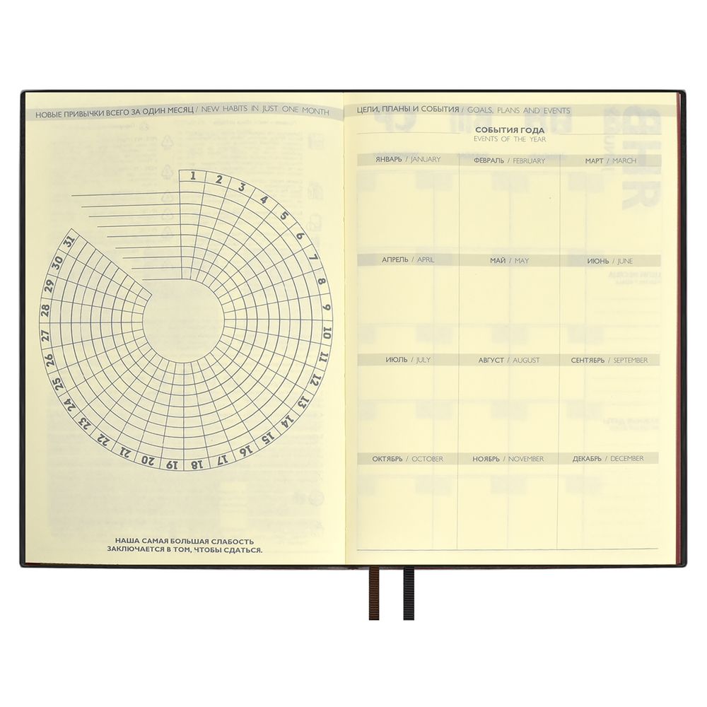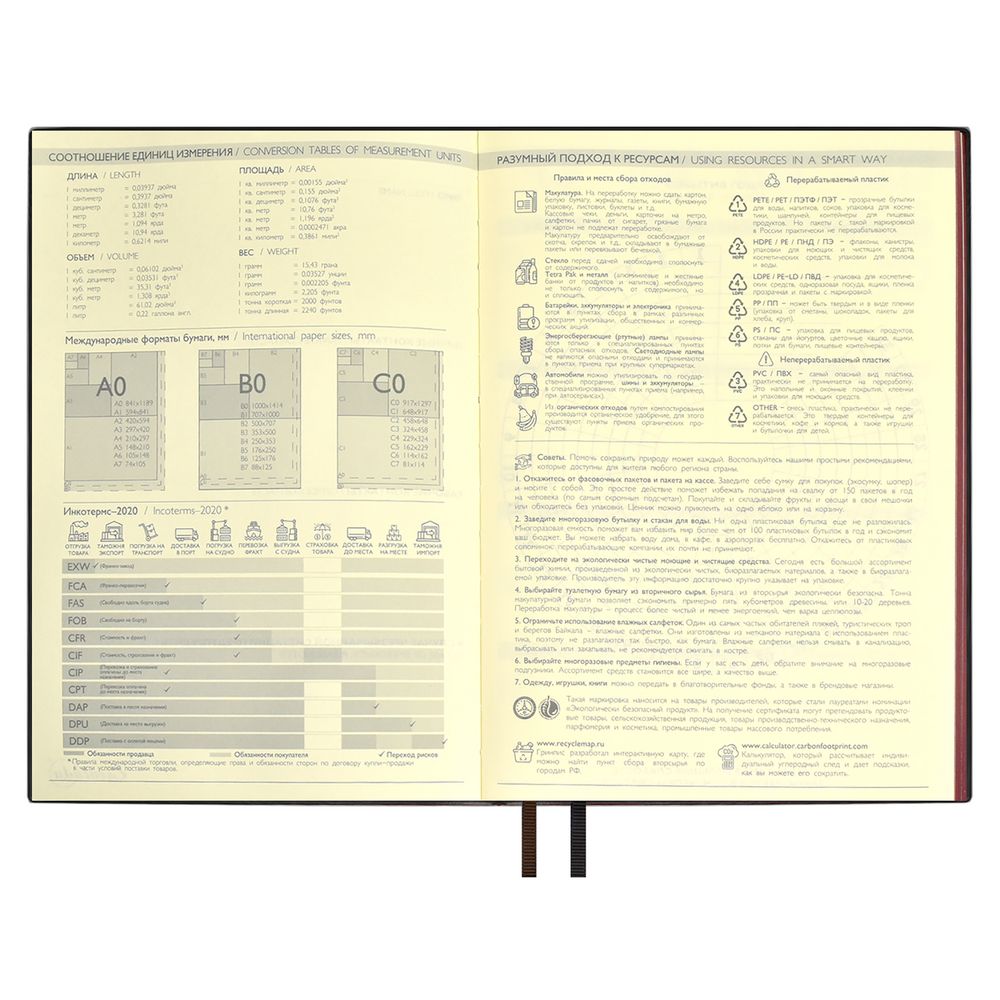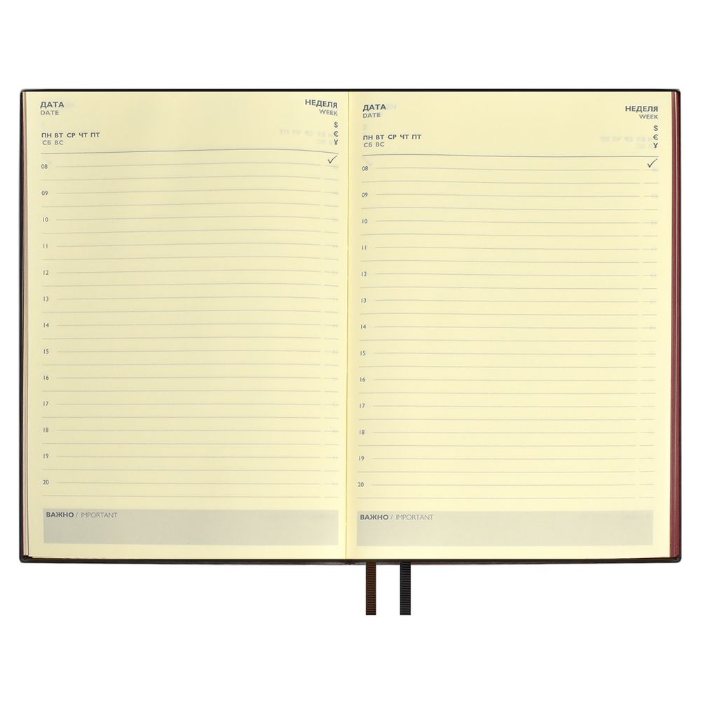 Ежедневник с гибкой обложкой и закладкой из искусственной кожи, дополнен капталом и двойным ляссе.