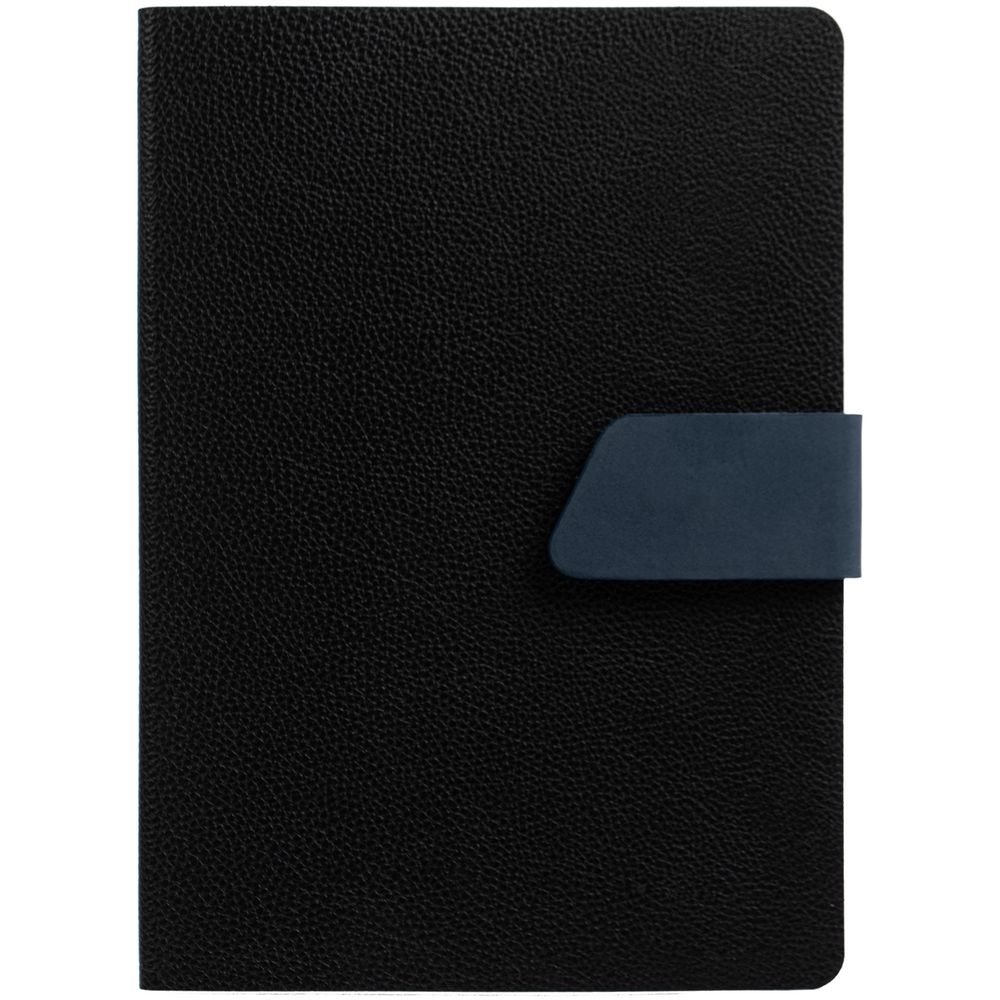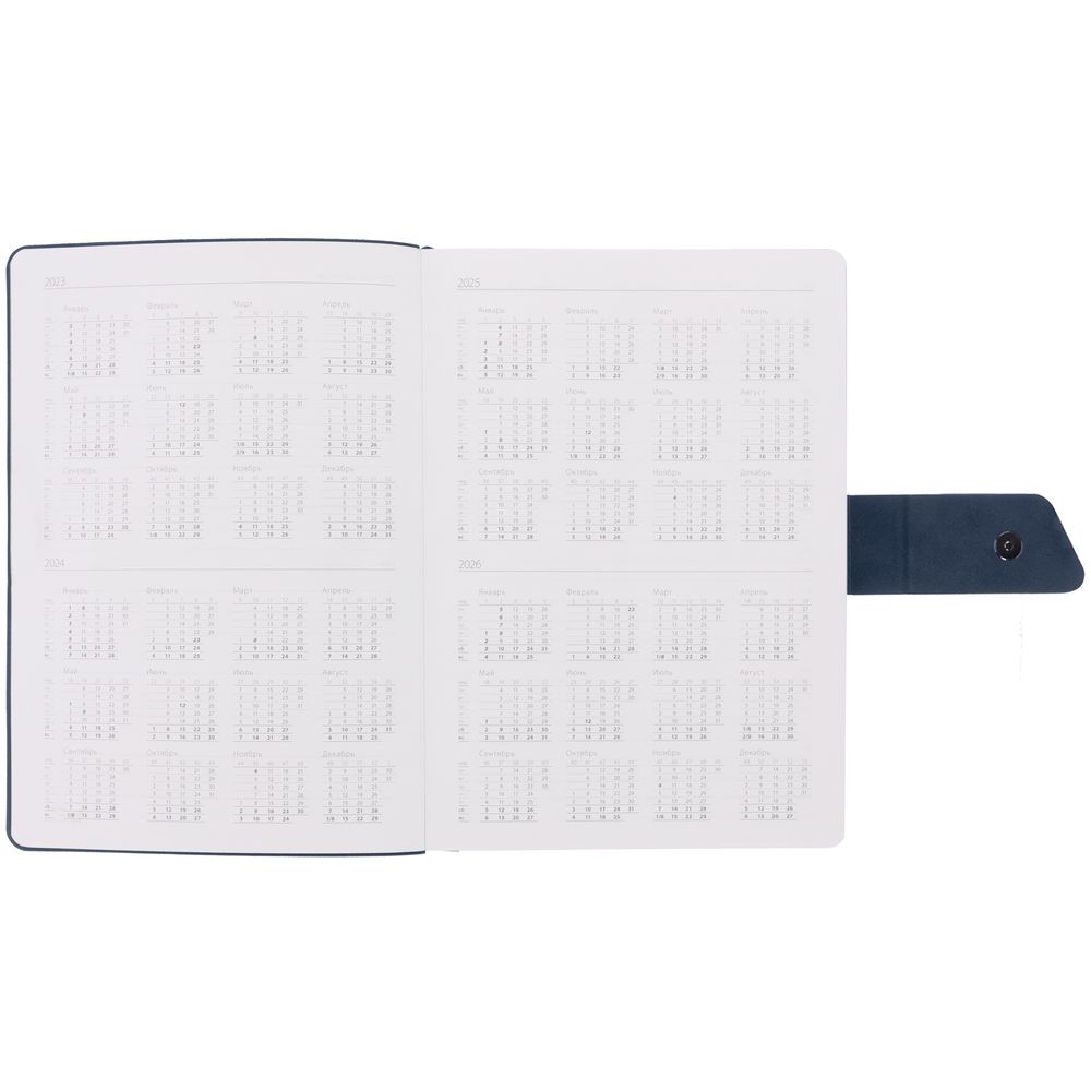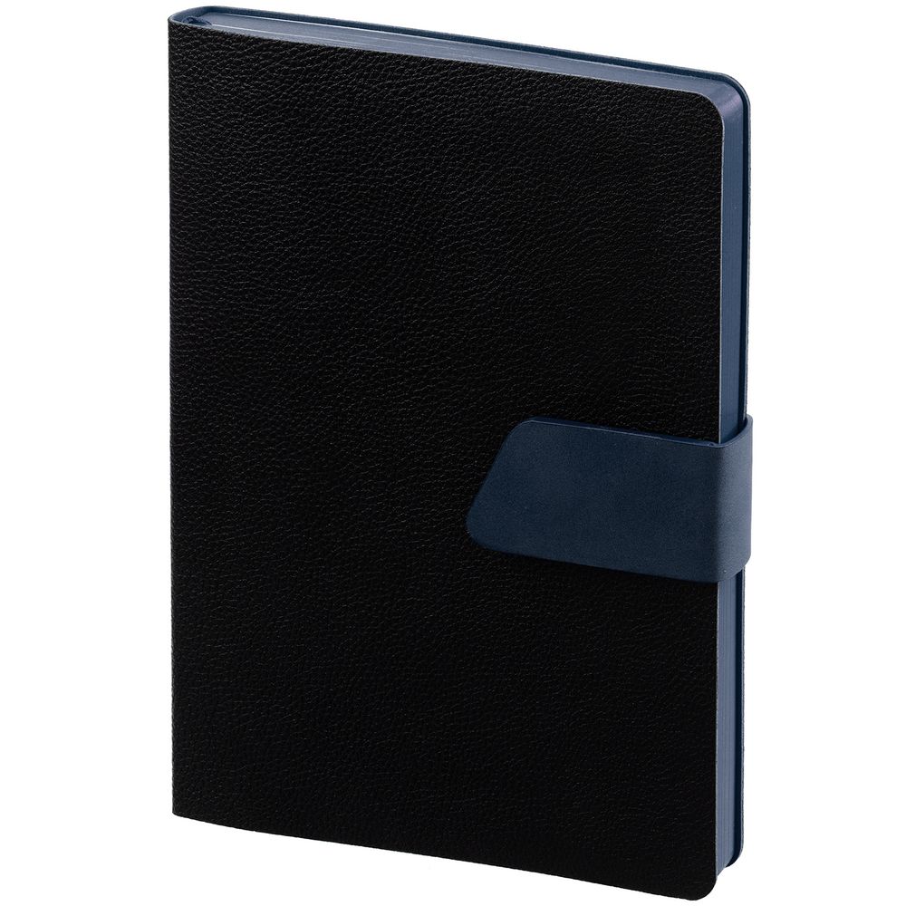 Ежедневник с гибкой обложкой, выполнен из материала La Fite, черный АА и Nubuck, темно-синий ХХ, дополнен синим ляссе и хлястиком на кнопке.