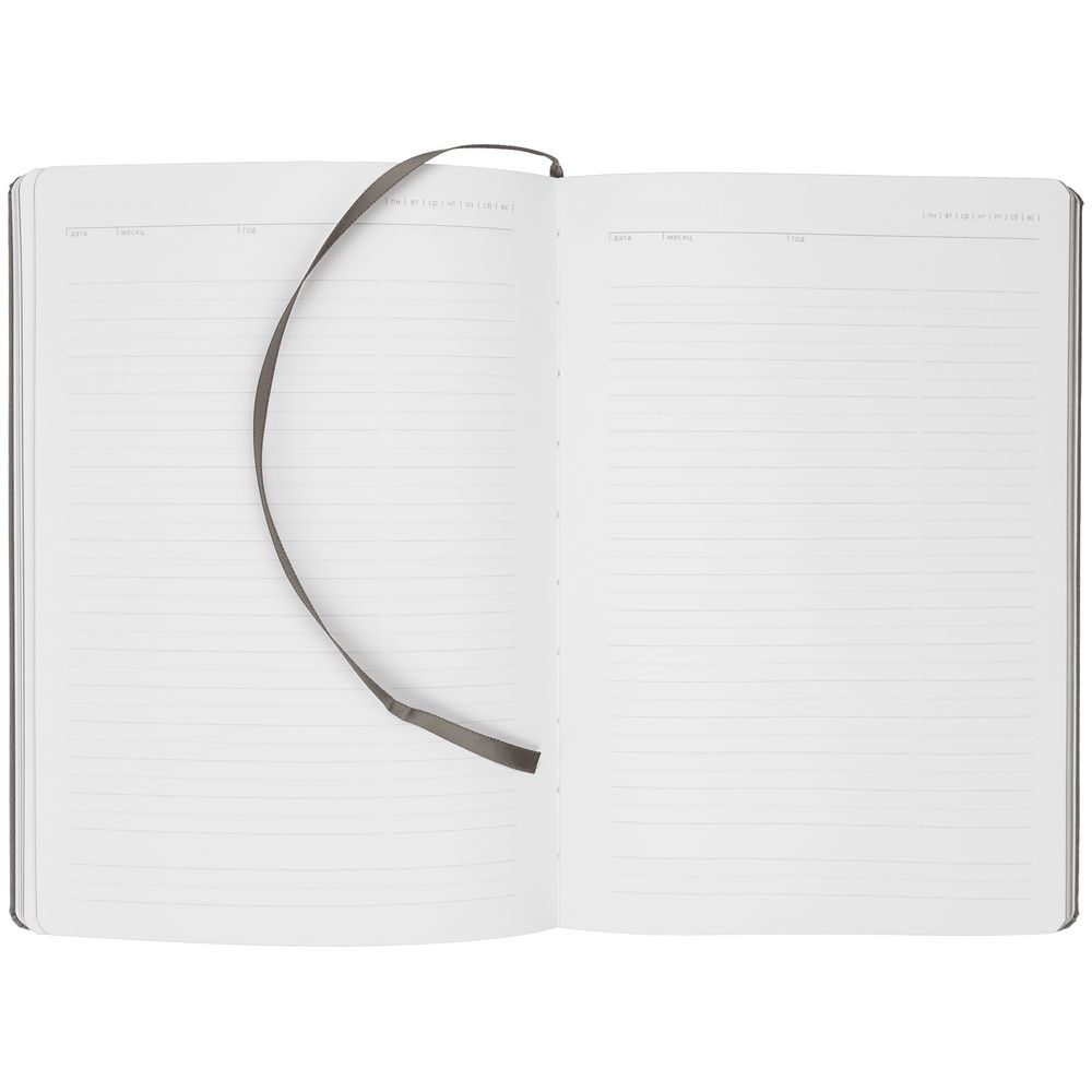 Ежедневник с твердой обложкой и тонированным обрезом. Выполнен из материала Latte, темно-серый, дополнен ляссе в цвет обложки.