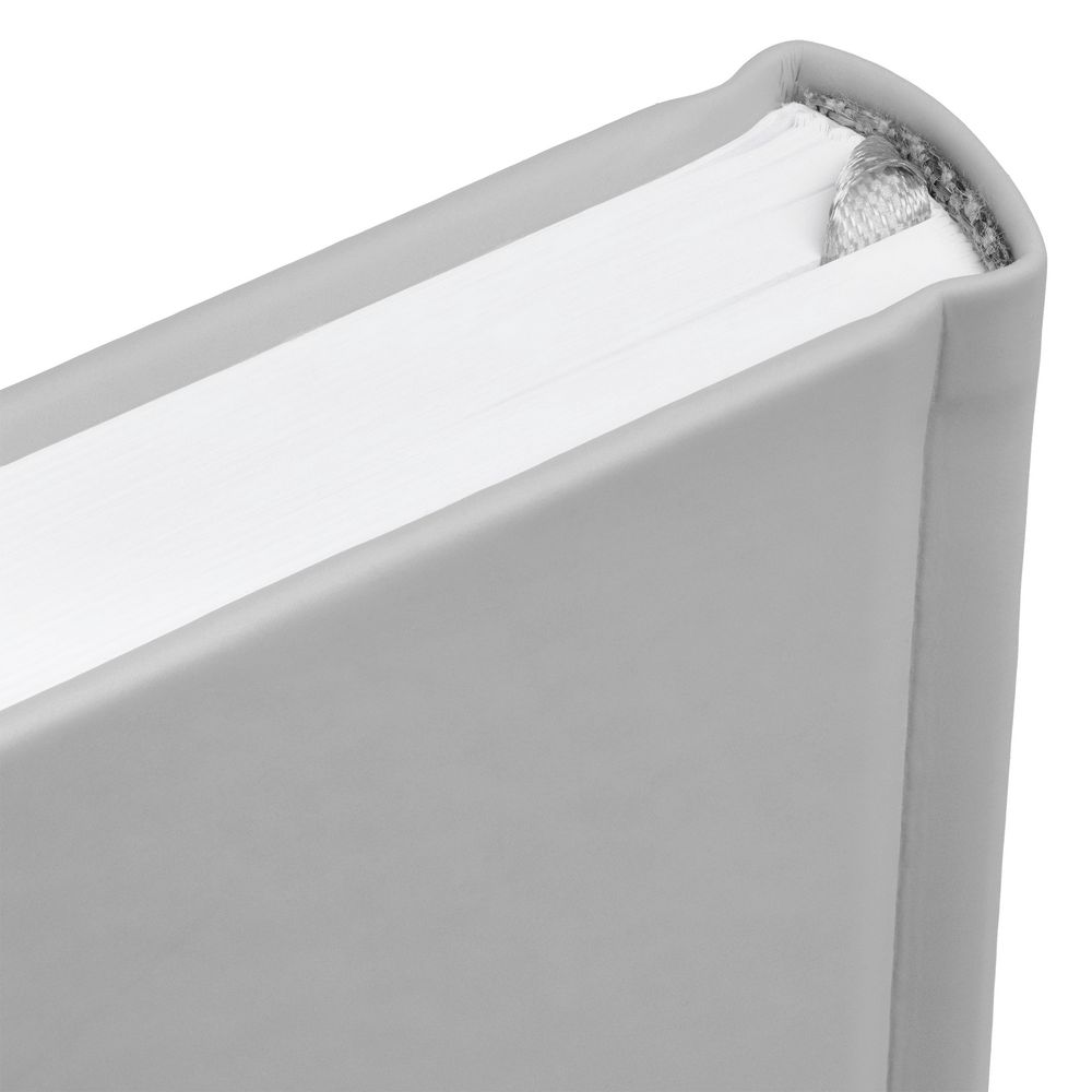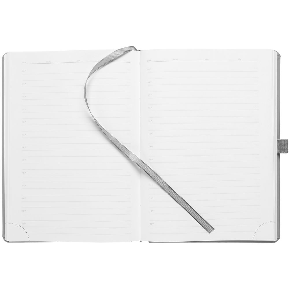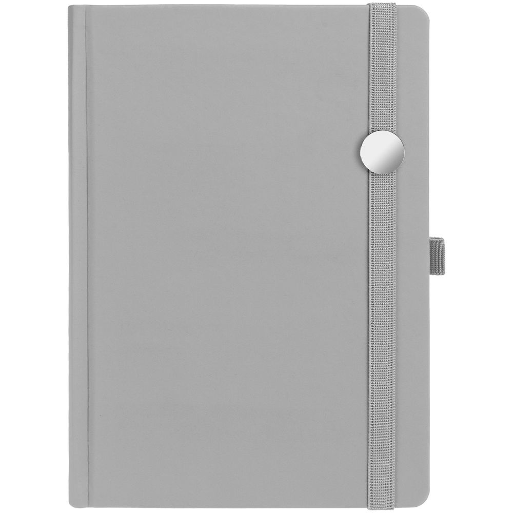 Ежедневник с твердой обложкой без поролона, выполнен из материала Soft Touch, серый СС, дополнен резинкой шириной 1 см, петлей-резинкой для ручки, капталом и ляссе серого цвета.