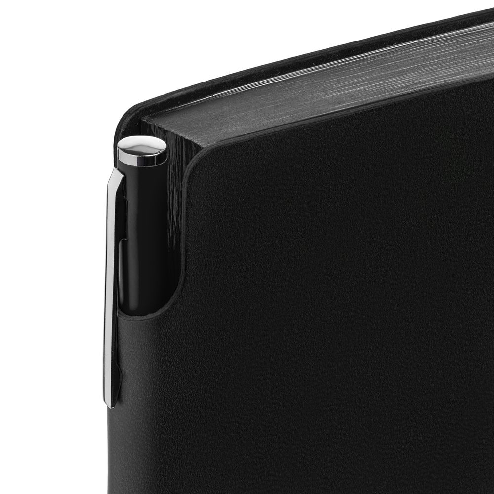 Гибкая обложка ежедневника выполнена из материала Latte, черный АА. Внутри корешка — специальное место для крепления ручки размером до 15х0,9 см.