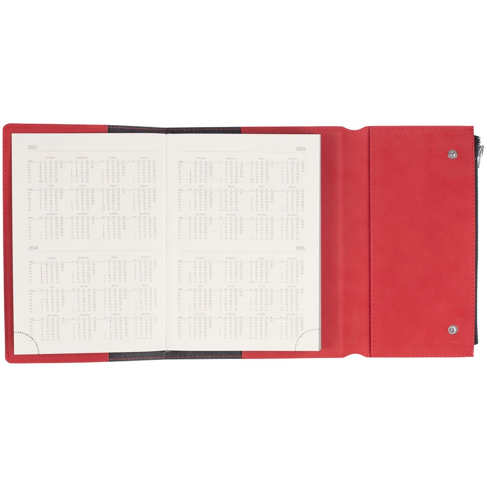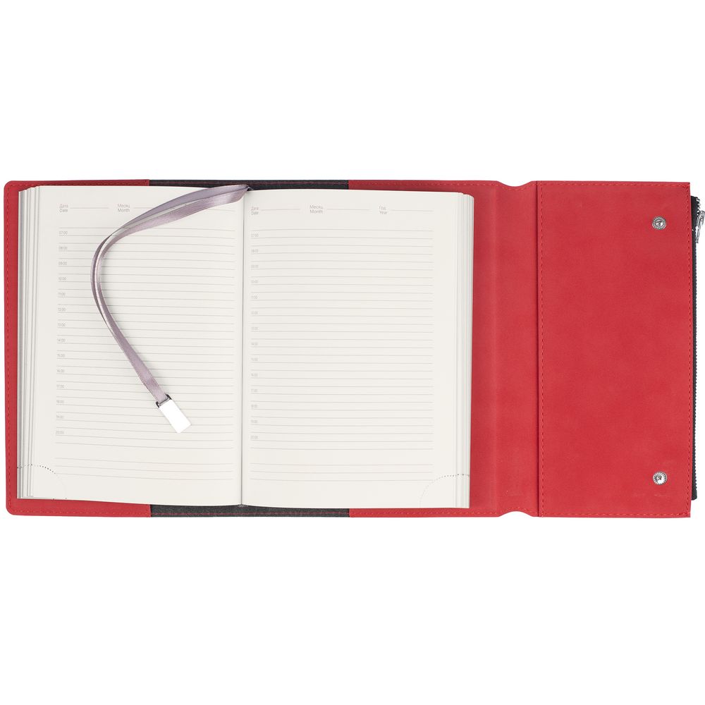 Ежедневник в гибкой суперобложке c карманом на молнии, выполнен из материала Nubuck, красный РР. Дополнен капталом и металлической шильдой на ляссе серого цвета.