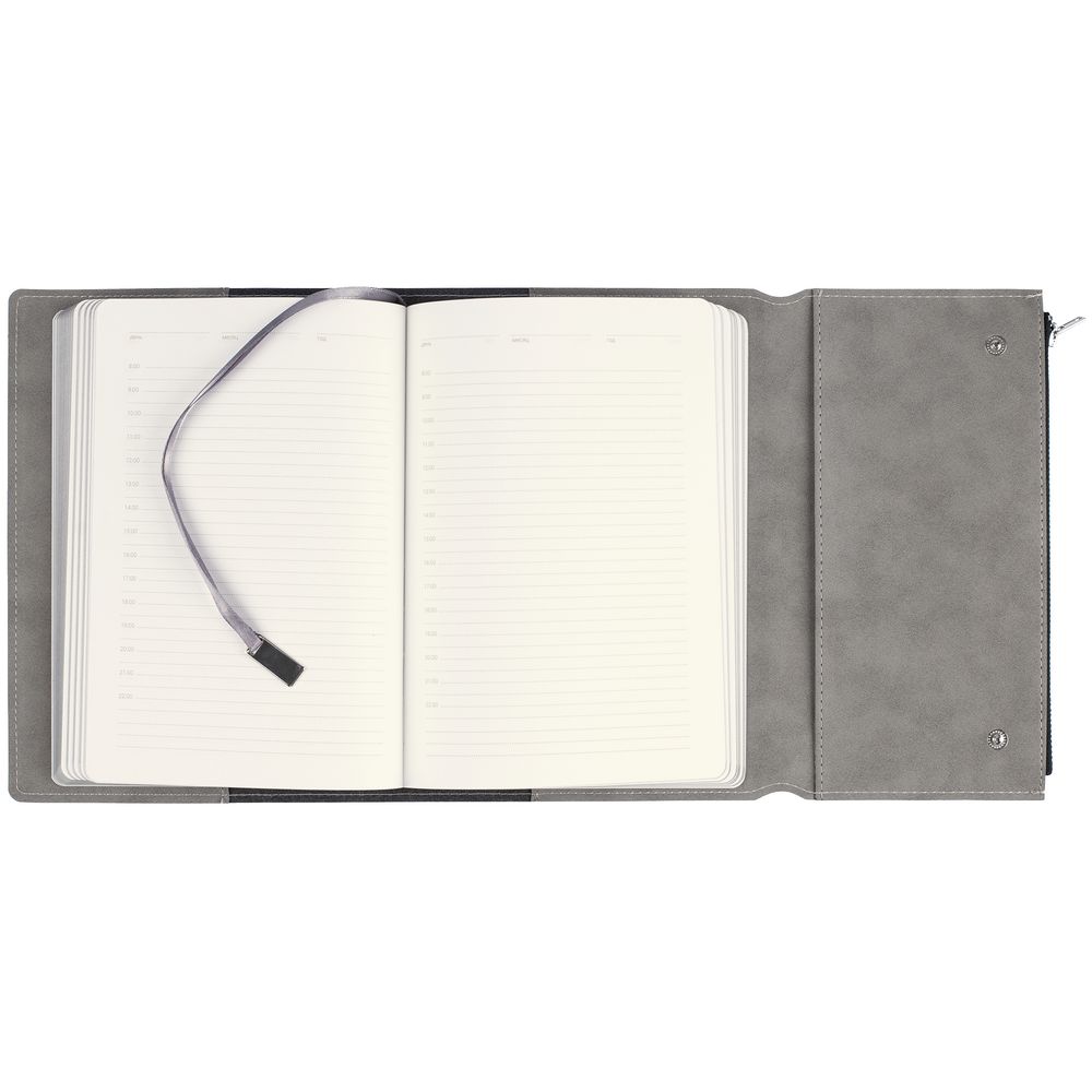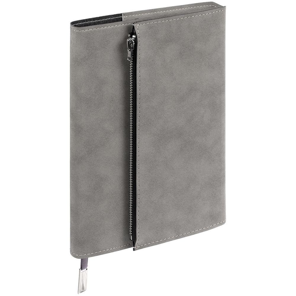 Ежедневник в гибкой суперобложке c карманом на молнии, выполнен из материала Nubuck, серый СС. Дополнен капталом и металлической шильдой на ляссе серого цвета.