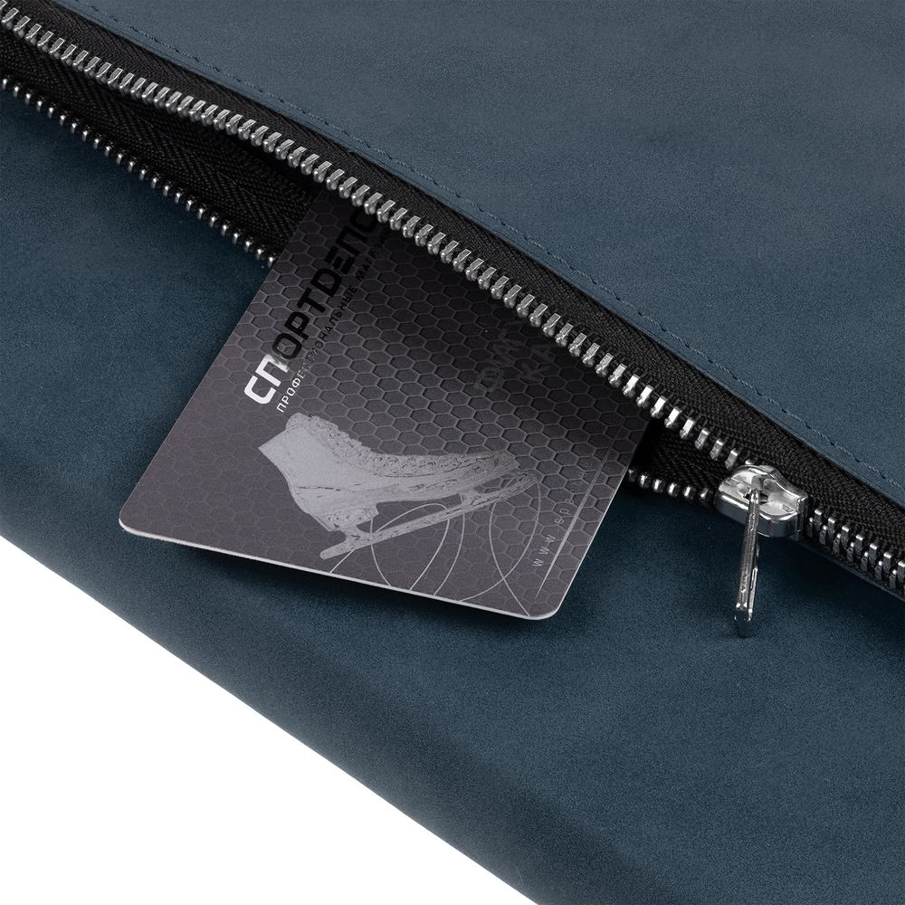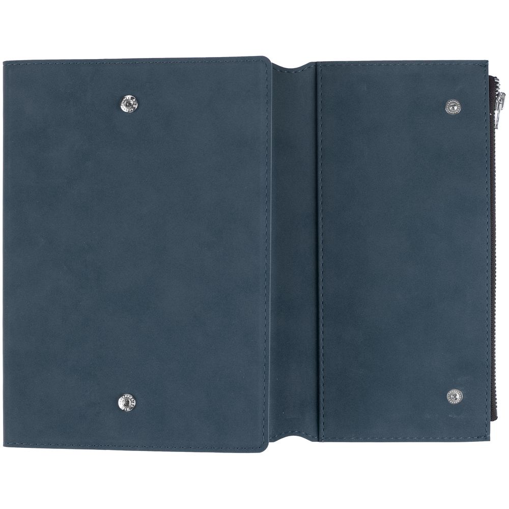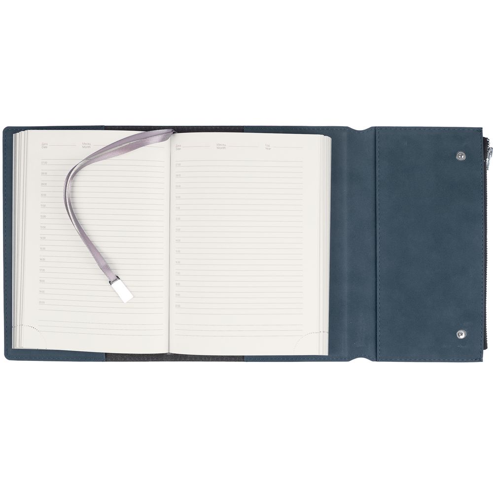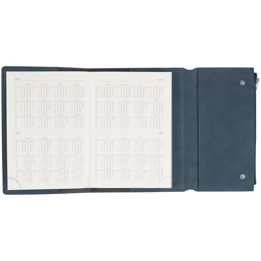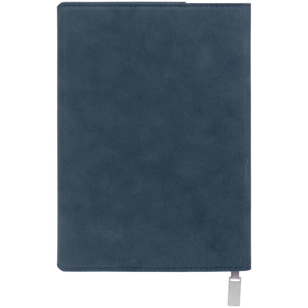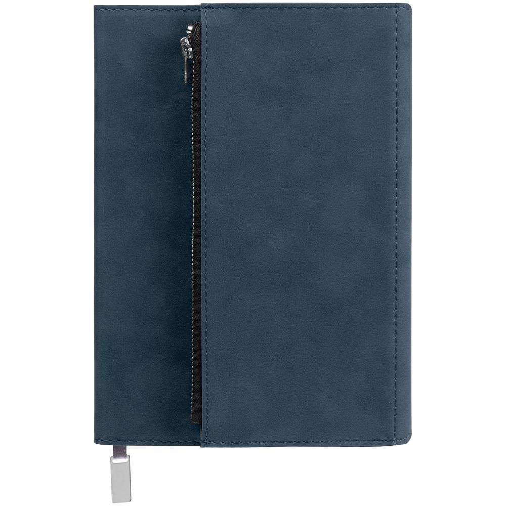 Ежедневник в гибкой суперобложке c карманом на молнии, выполнен из материала Nubuck, темно-синий ХХ. Дополнен капталом и металлической шильдой на ляссе серого цвета.