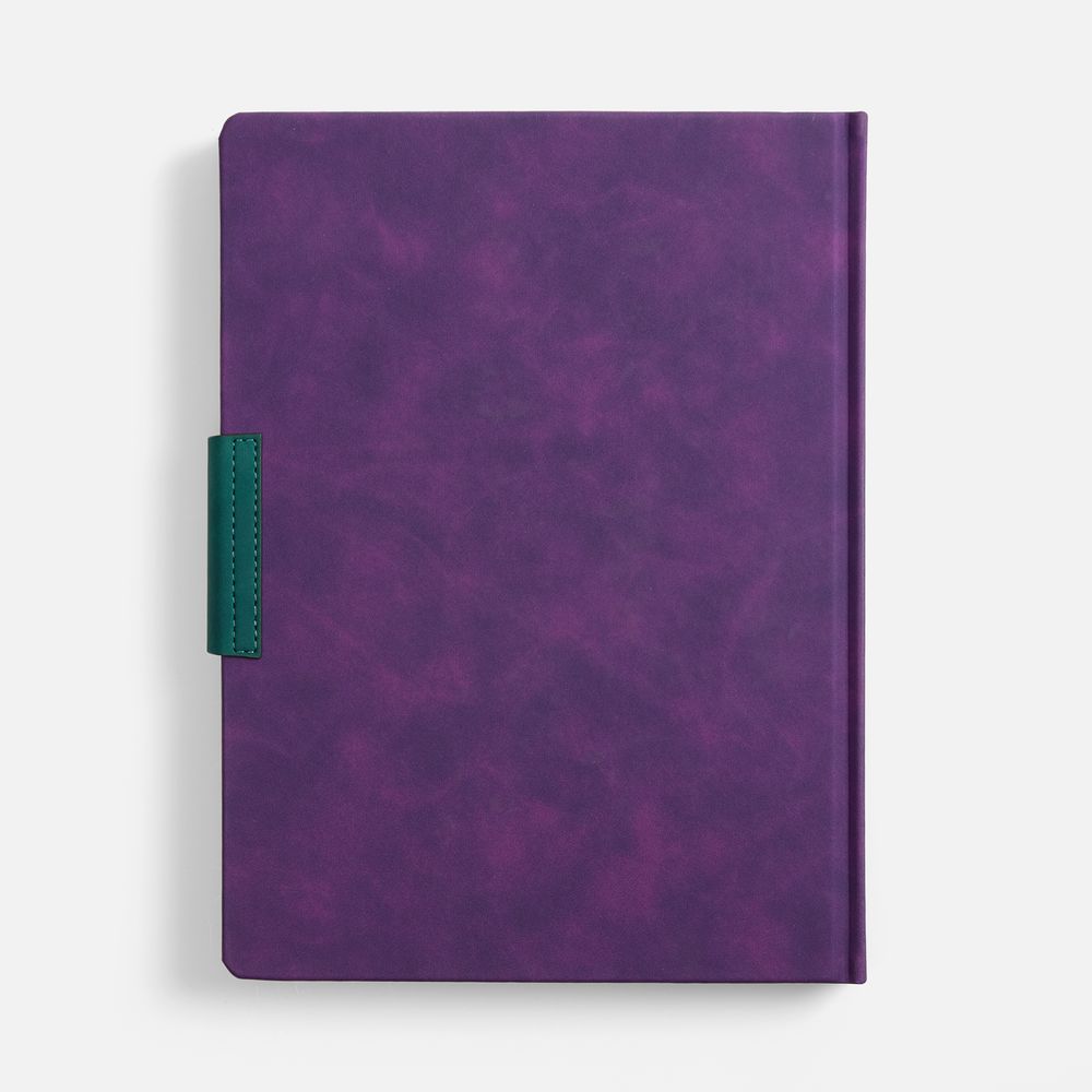 Ежедневник с твердой обложкой, выполнен из материала Nubuck Touch, фиолетовый UU, дополнен капталом, ляссе и обрезом синего цвета. Застежка — хлястик на магните из материала Nubuck Touch, темно-зеленый VV.