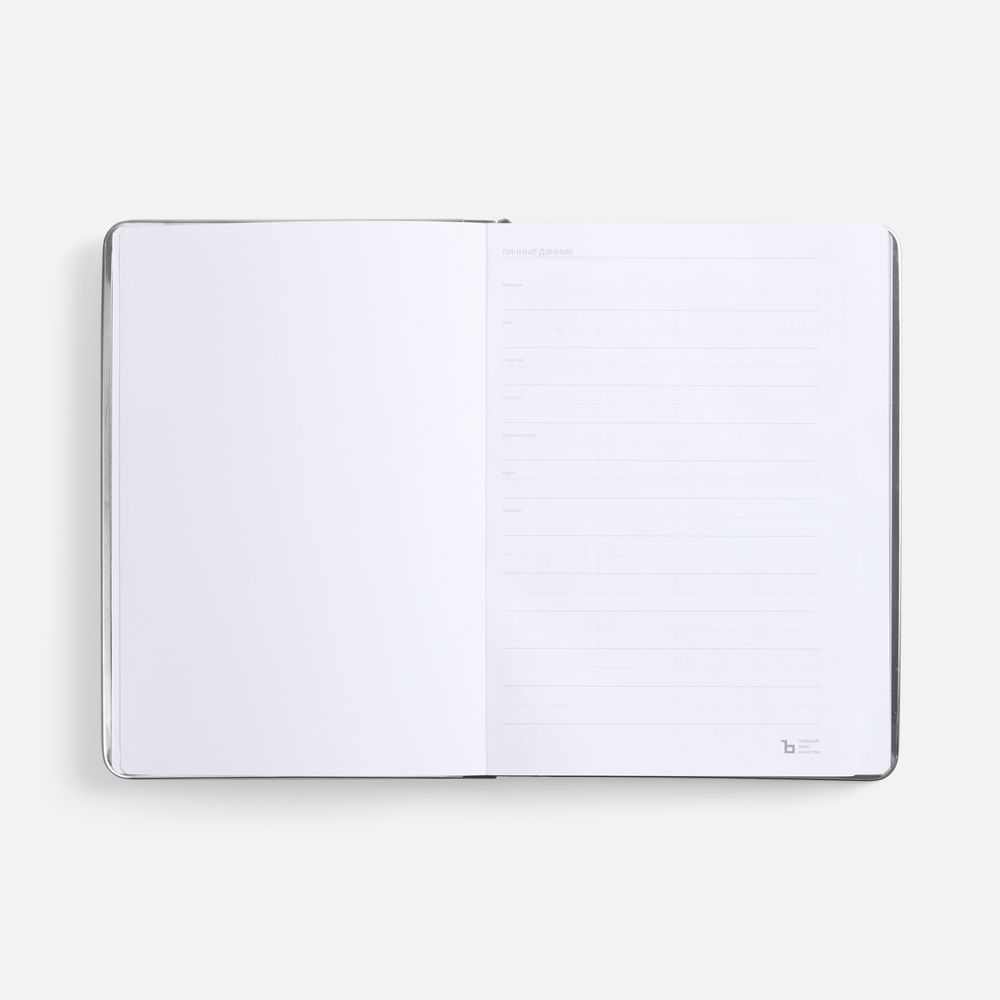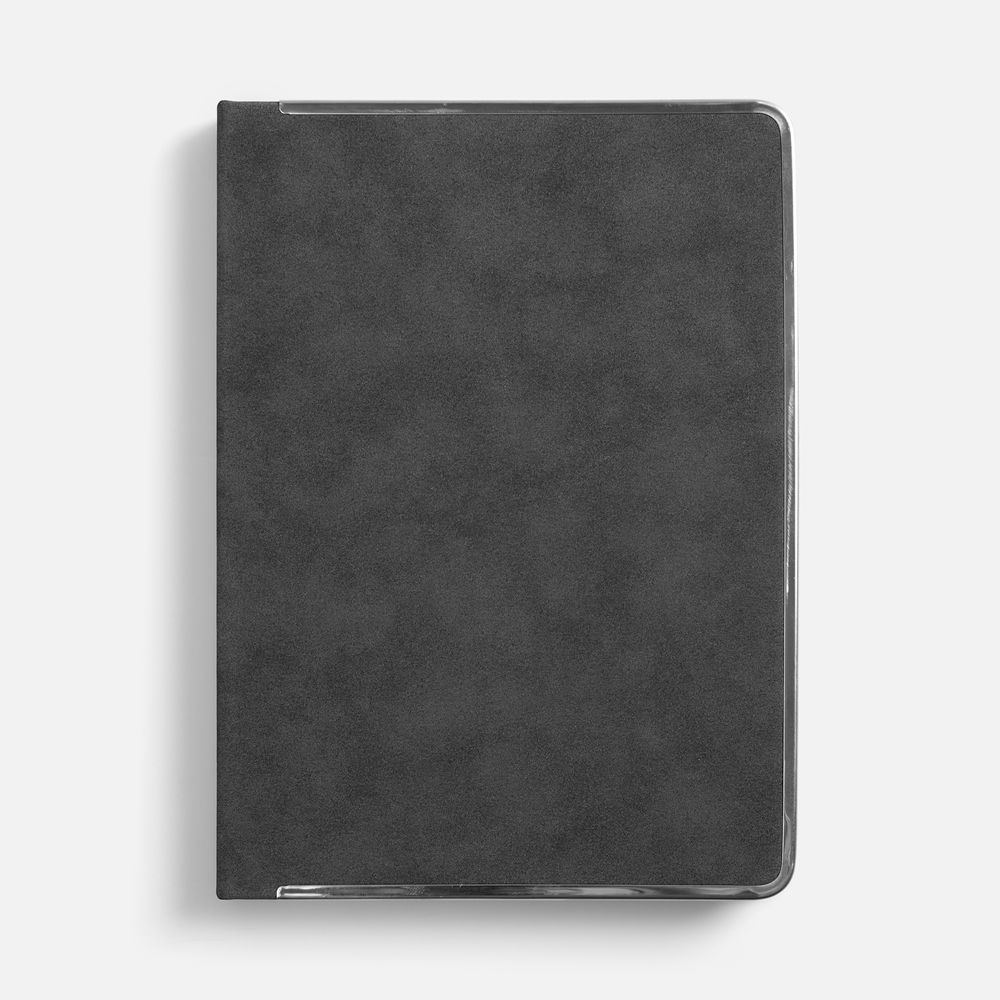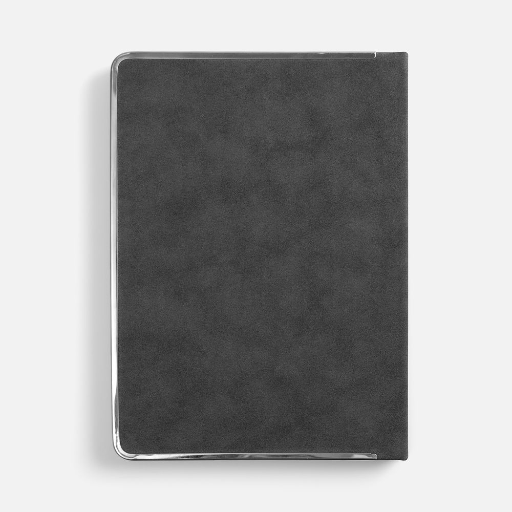 Ежедневник с твердой обложкой и серебристым  обрезом блока. Выполнен из материала Nubuck, темно-серый ЕЕ, дополнен серым ляссе и металлическими рамками с двух сторон обложки.