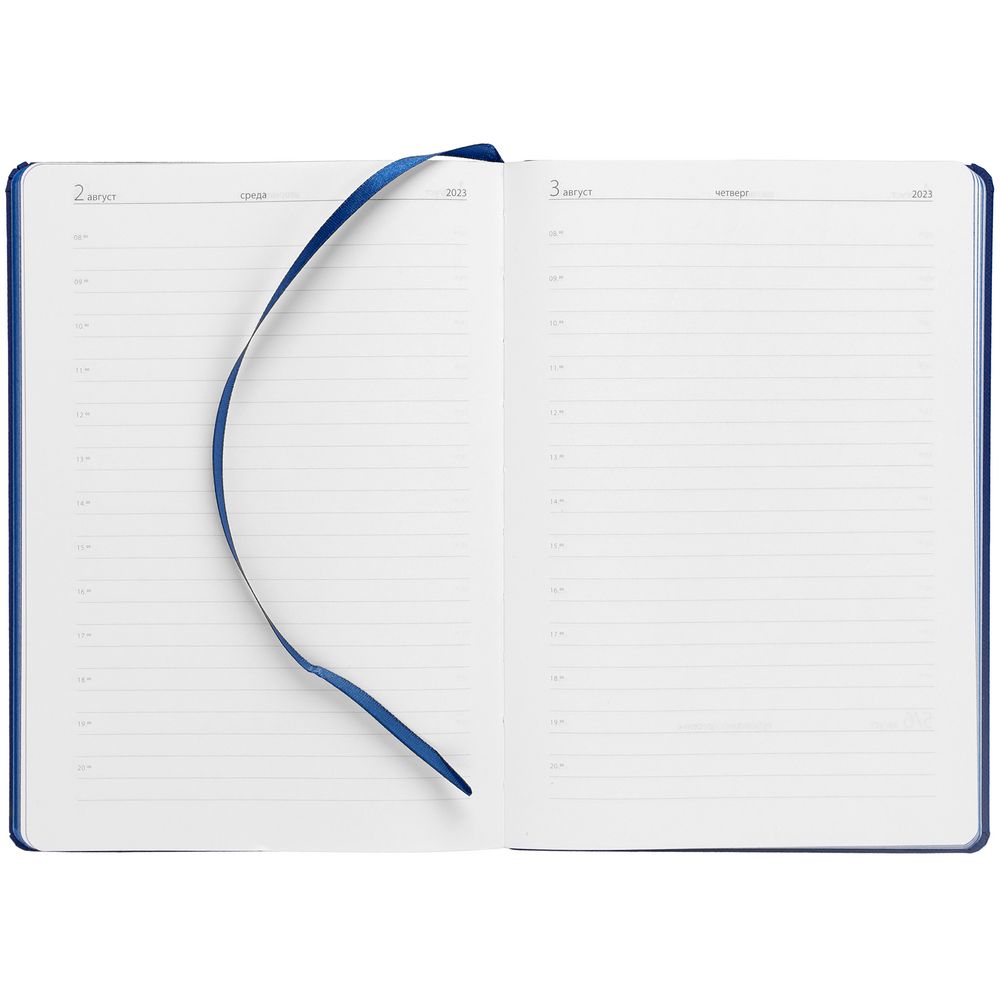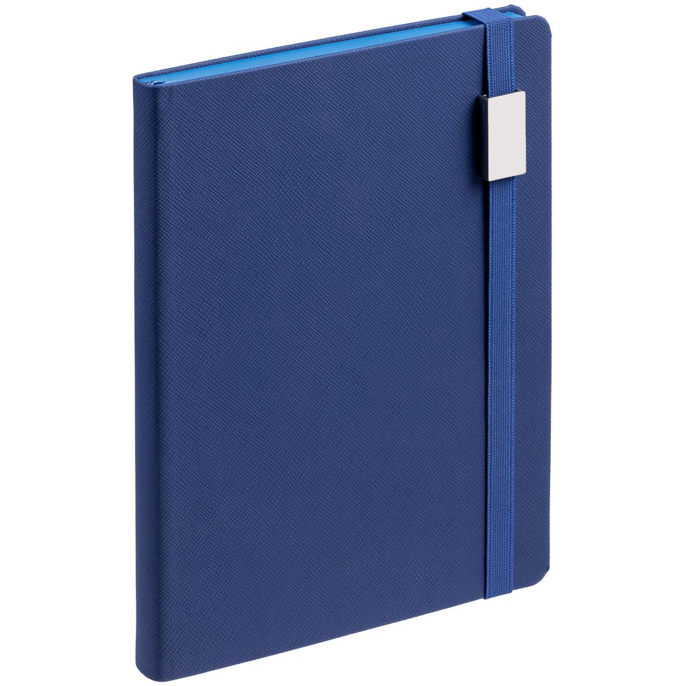Ежедневник с полутвердой обложкой выполнен из материала Nice Touch, синий НН, и дополнен резинкой шириной 1 см с металлическим шильдом и ляссе синего цвета.