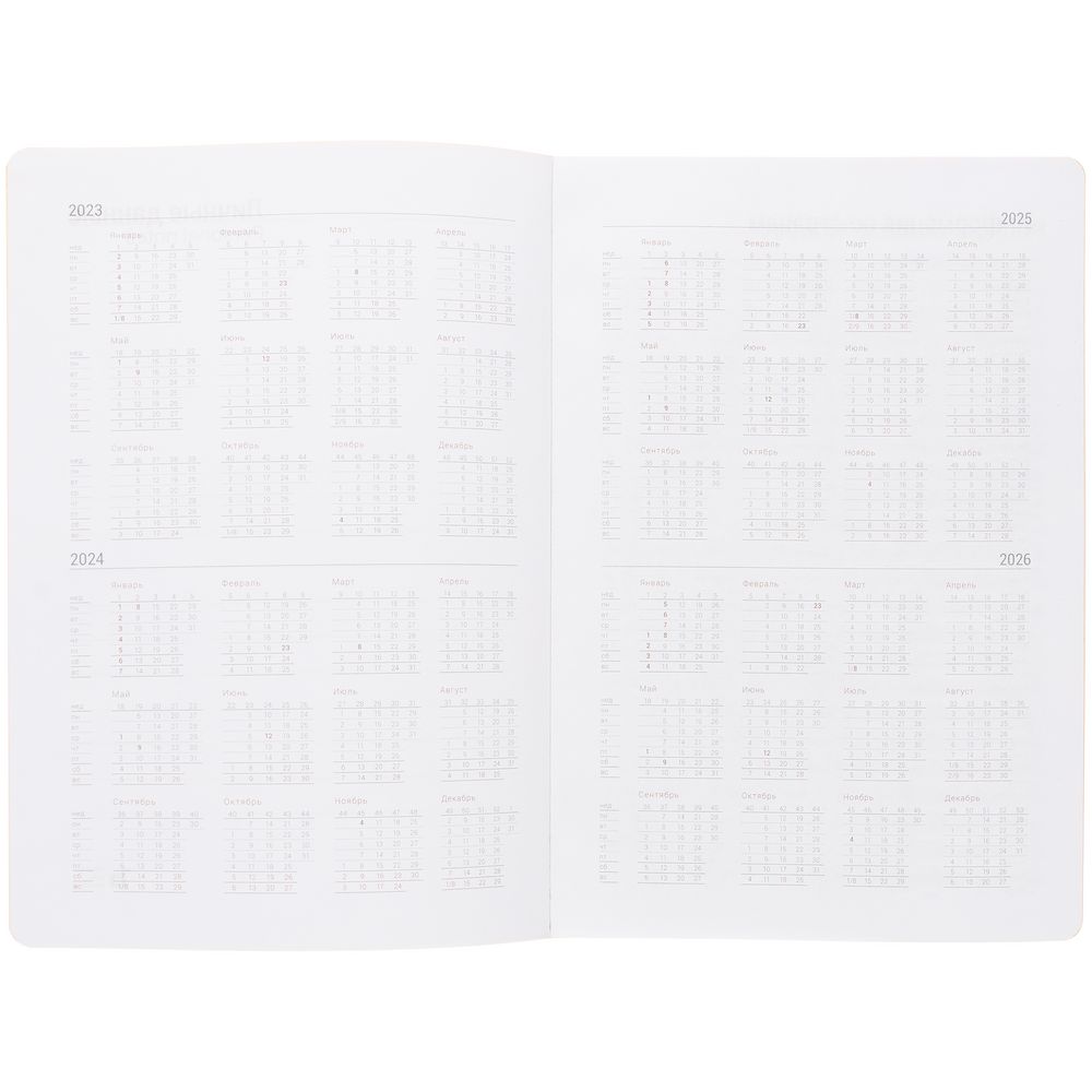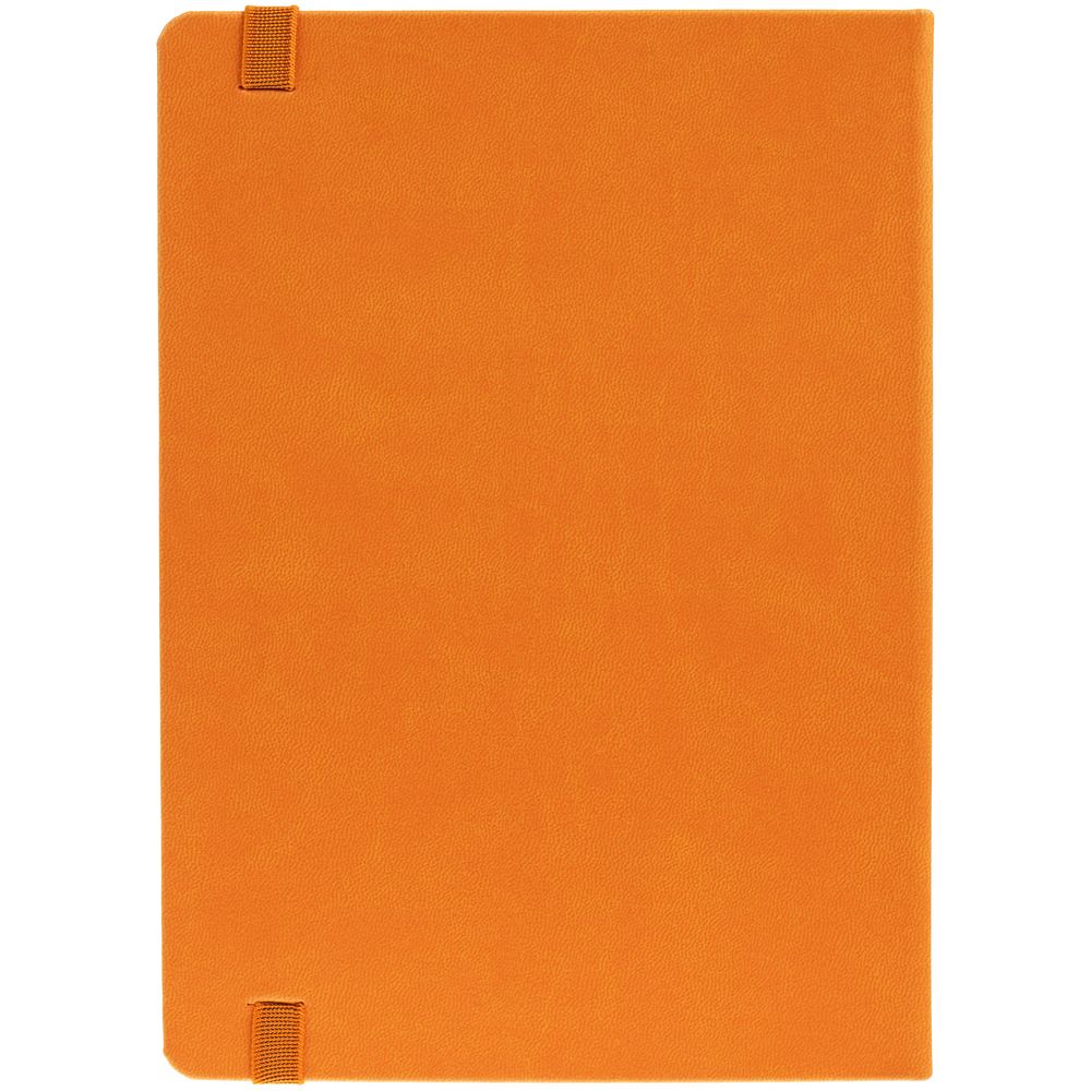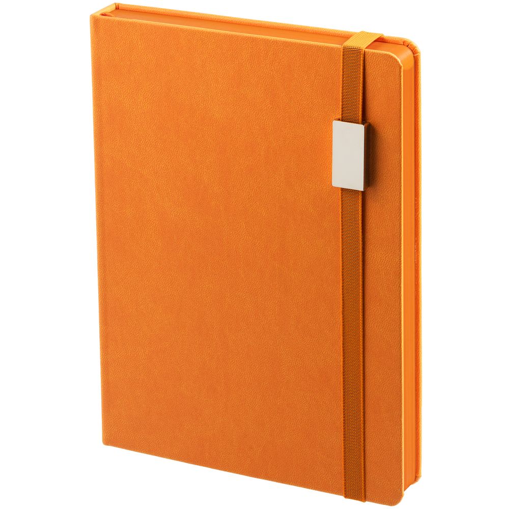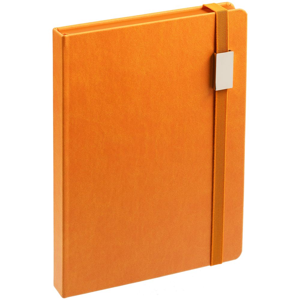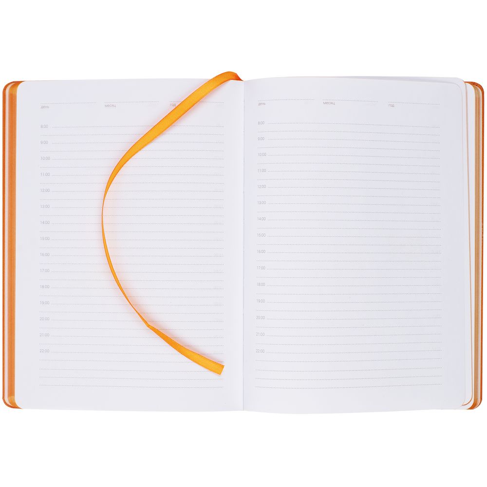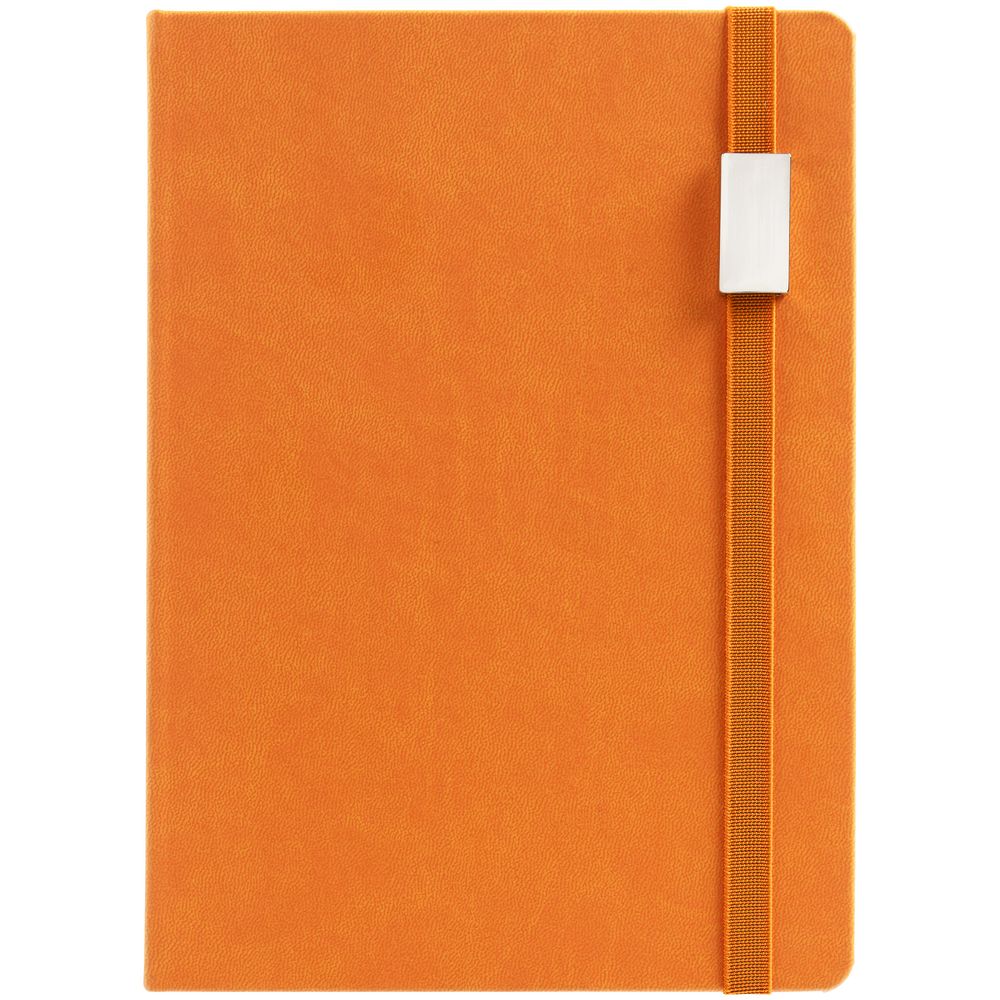 Ежедневник с твердой обложкой, выполнен из материала Latte, оранжевый ОО, обрез оранжевого цвета, дополнен ляссе оранжевого цвета и резинкой с металлическим шильдом.