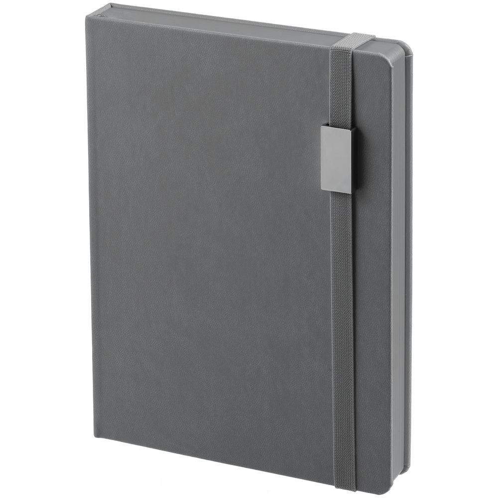 Ежедневник с твердой обложкой, выполнен из материала Latte, серый СС, обрез серого цвета, дополнен ляссе серого цвета и резинкой с металлическим шильдом.