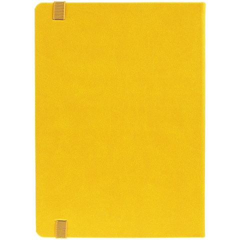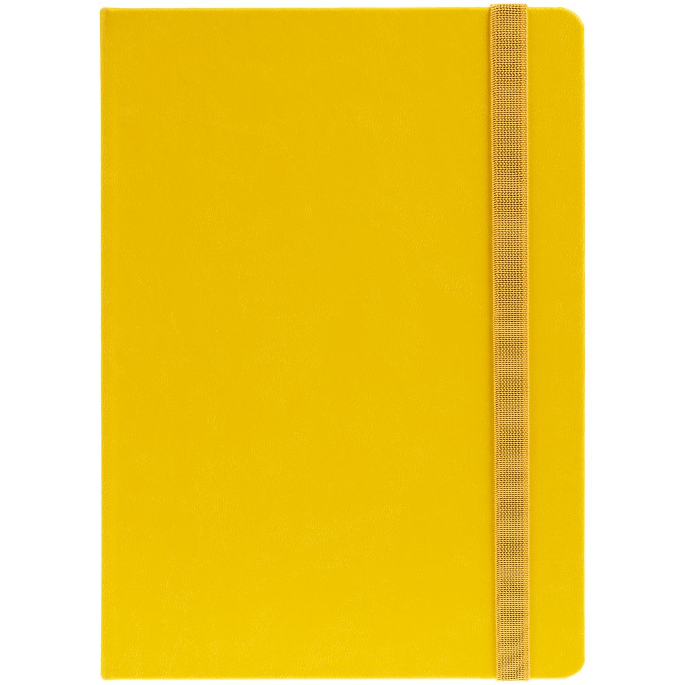 Ежедневник с твердой обложкой, выполнен из материала Latte, желтый КК, обрез зеленого цвета, дополнен резинкой и ляссе желтого цвета.