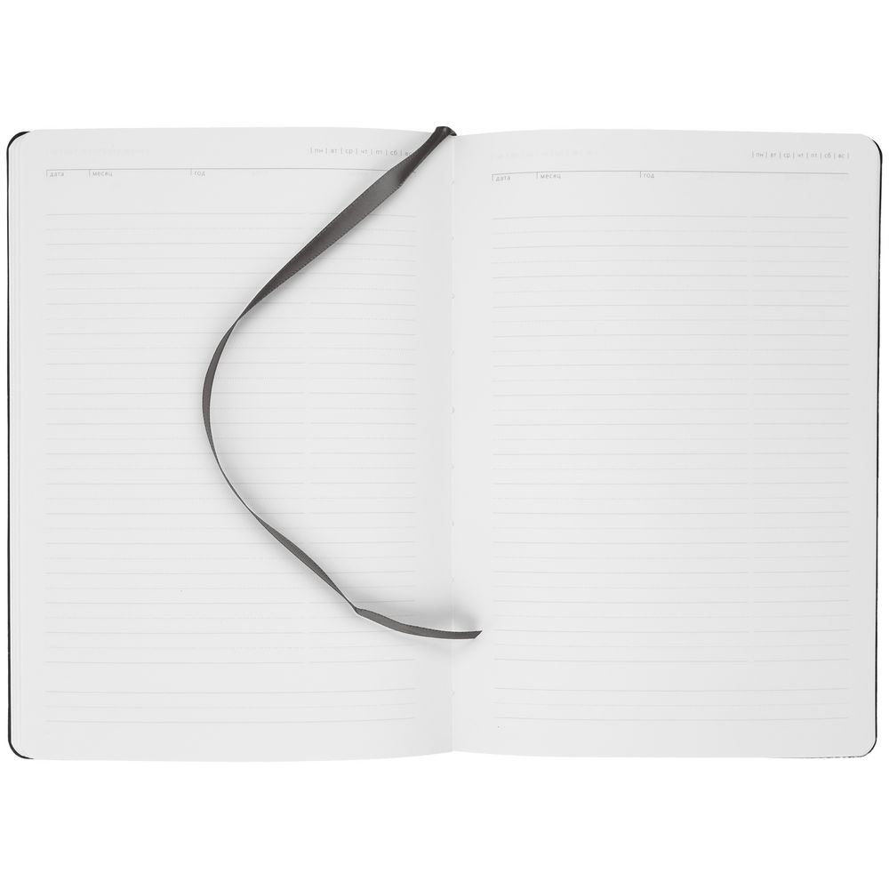 Ежедневник с твердой обложкой. Выполнен из материала Latte, серый СС, дополнен ляссе в цвет обложки.