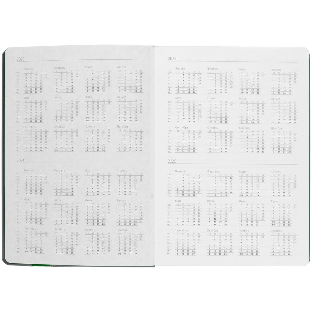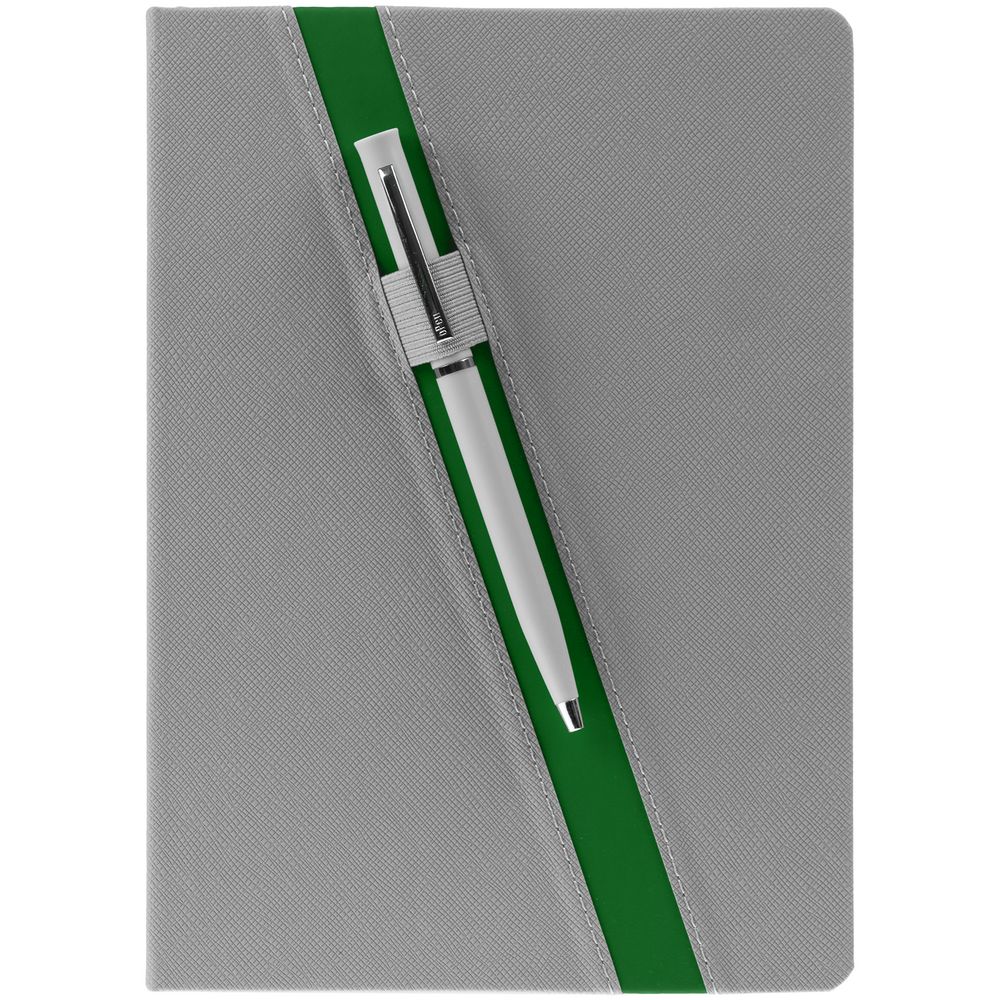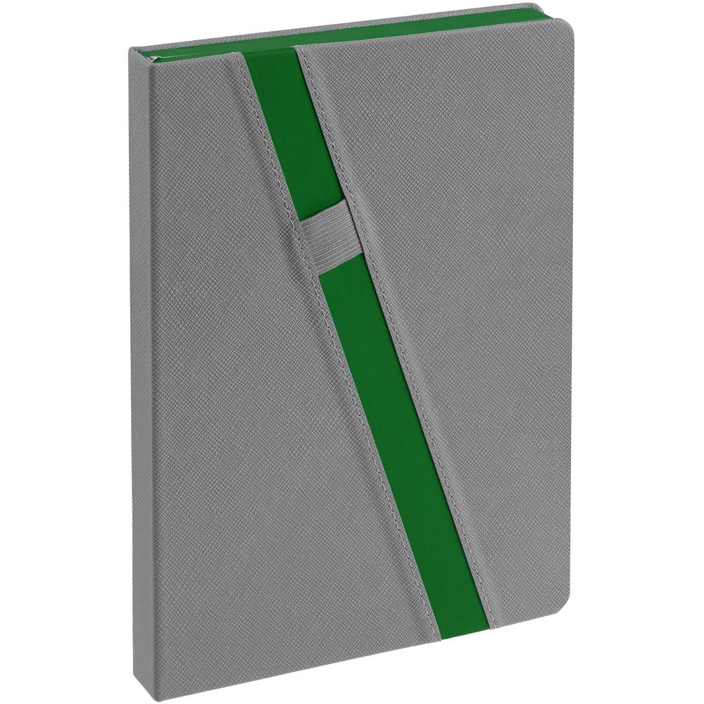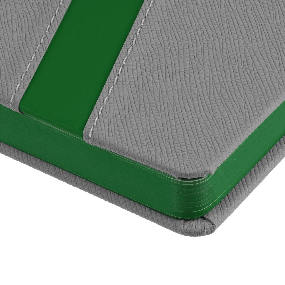 Ежедневник с твердой обложкой и тонированным обрезом. Выполнен из материала Nice Touch, серый СС, и Soft Touch Ultra, зеленый FF, дополнен серым ляссе.