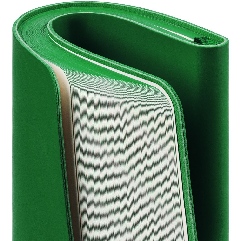 Ежедневник с гибкой обложкой, выполнен из материалов Soft Touch Ultra, зеленый FF, и Latte, зеленй (внутренняя часть обложки), дополнен ляссе в цвет обложки с металлическим шильдиком.