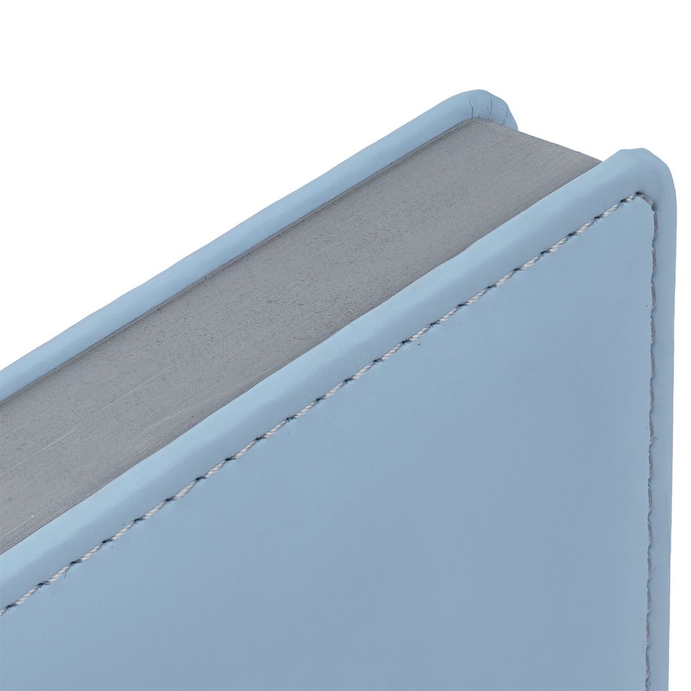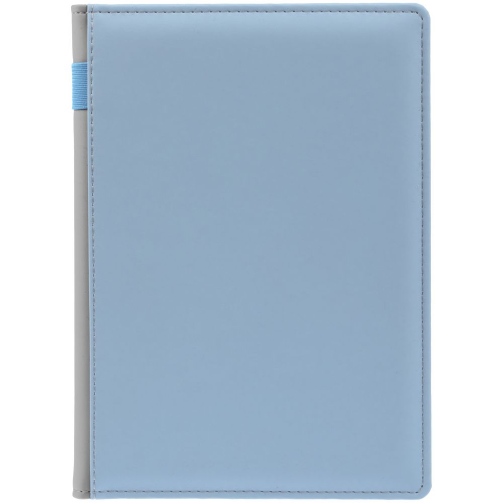 Твердая обложка с поролоном, материал обложки — Soft Touch, голубой JJ и Soft Touch, серый СС. На корешке ежедневника находится петля из резинки.
