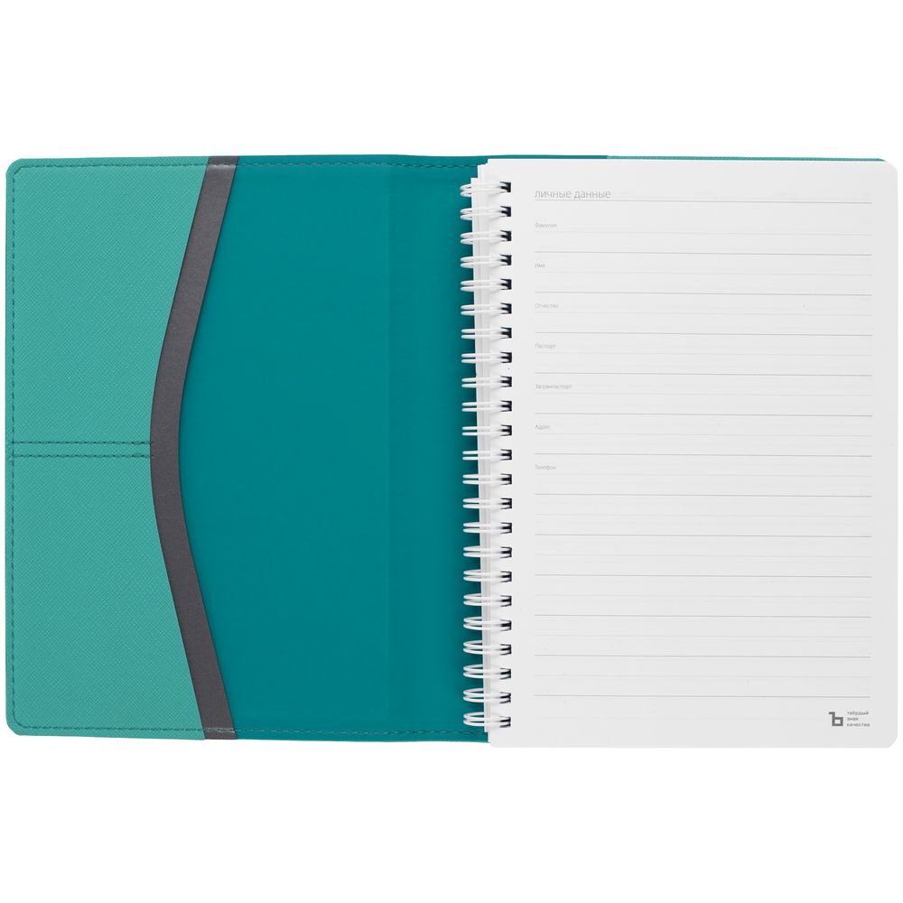 Ежедневник с блоком на пружине в твердой обложке, выполнен из материалов Nice Touch, цвет морской волны и Soft Touch Pearl серый.