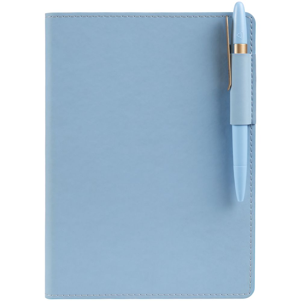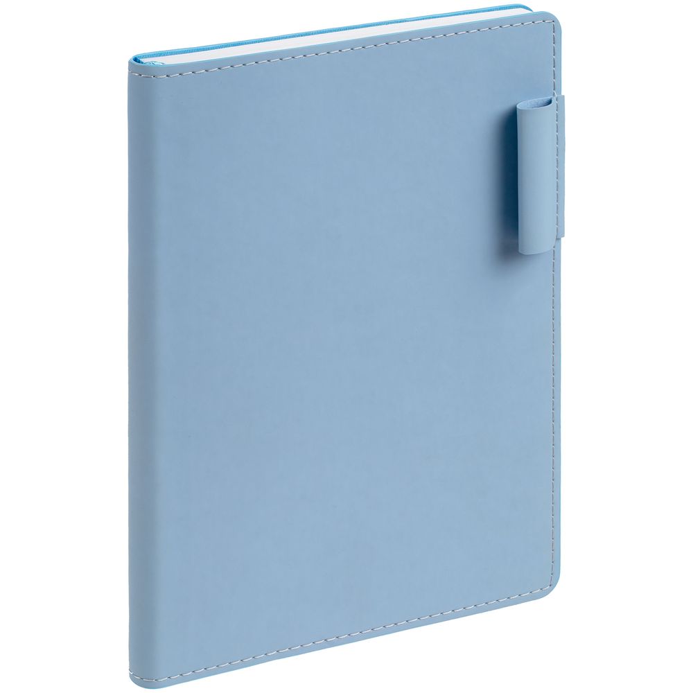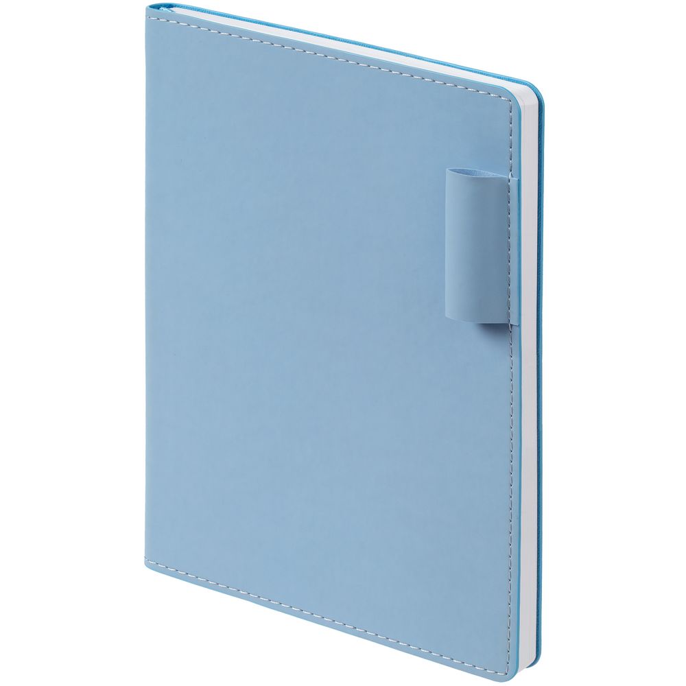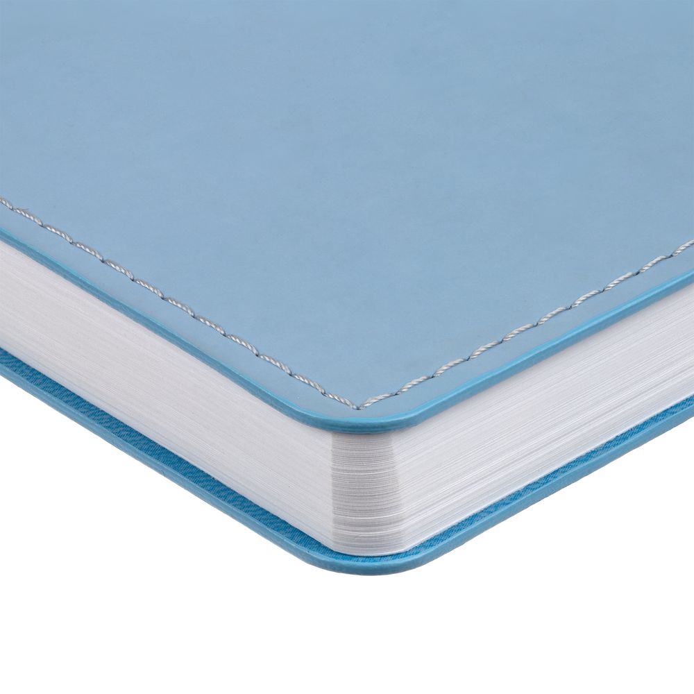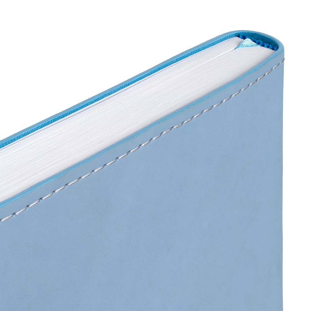 Ежедневник с гибкой обложкой из материала Soft Touch, голубой и Latte, голубой, дополнен петелькой для ручки из покровного материала, капталом, ляссе и закрашенным срезом обложки в цвет материала.
