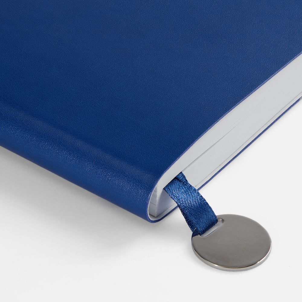 Ежедневник с гибкой обложкой, выполнен из материала Waltz, синий НН, дополнен ляссе в цвет обложки с металлическим шильдом.