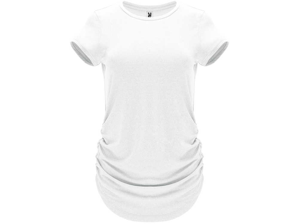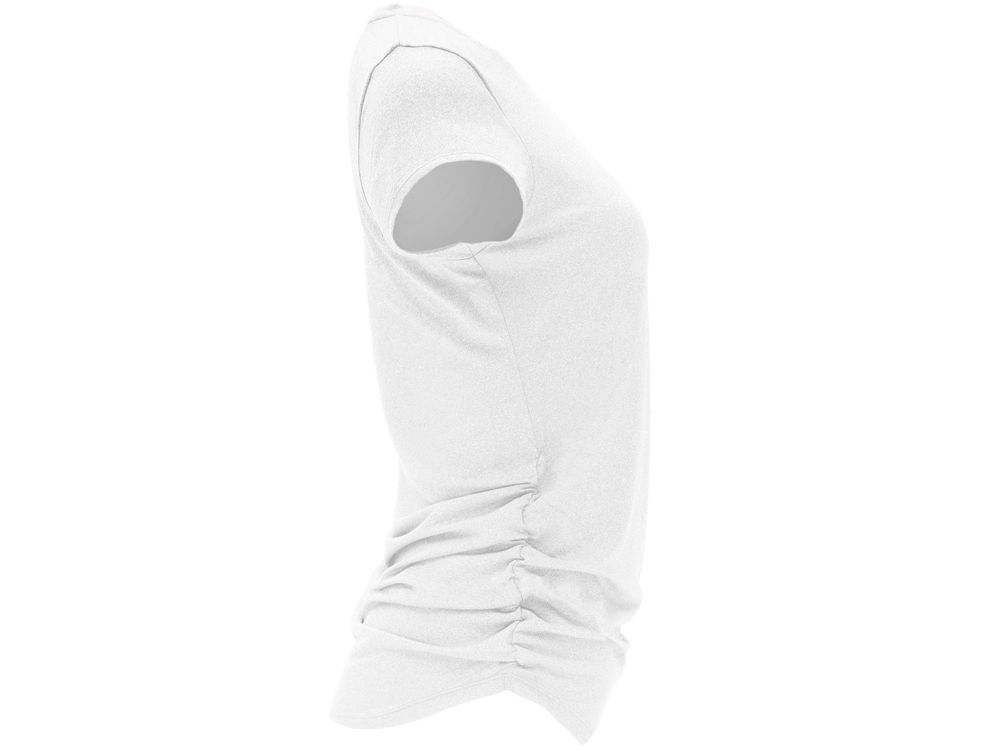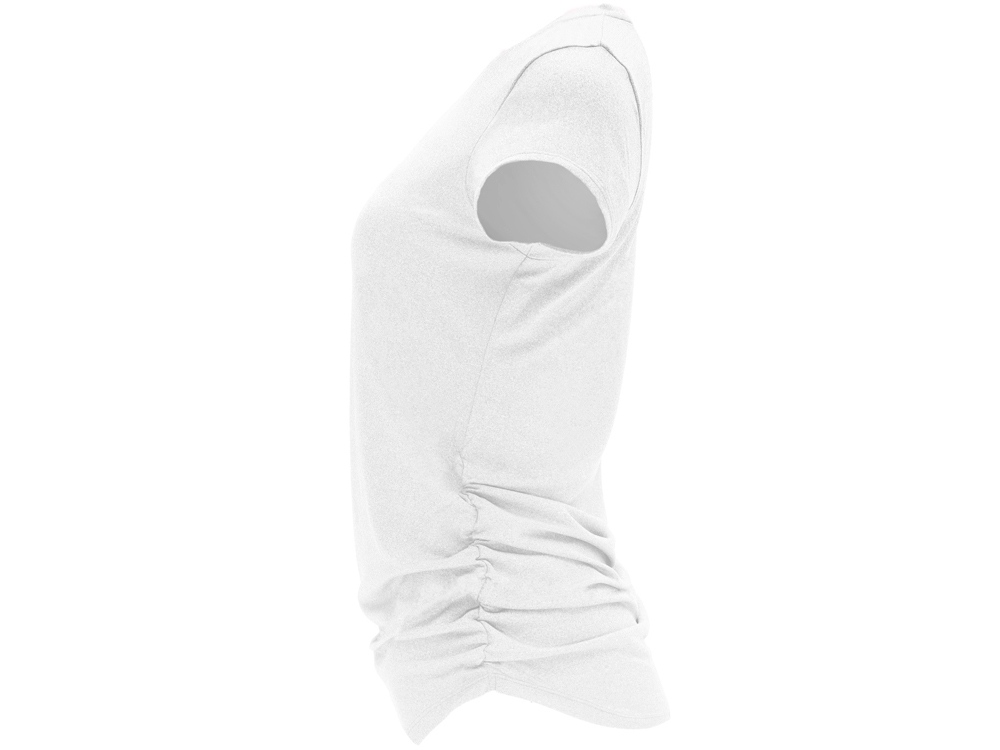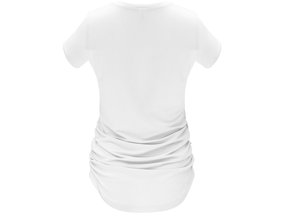 Спортивная футболка с коротким рукавом для женщин. Полотно из полиэстера на ощупь напоминающее хлопок. Круглый вырез горловины обработан бейкой из того же полотна. Эластичная драпировка по боковым швам для лучшей посадки по фигуре. Узкий силуэт.