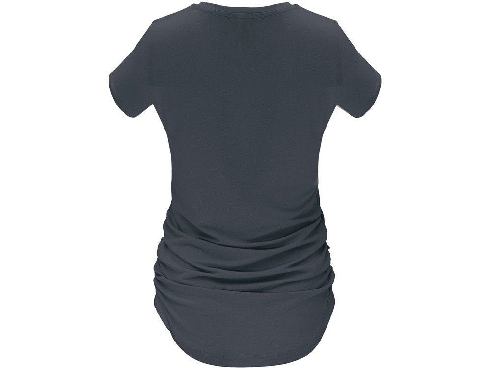 Спортивная футболка с коротким рукавом для женщин. Полотно из полиэстера на ощупь напоминающее хлопок. Круглый вырез горловины обработан бейкой из того же полотна. Эластичная драпировка по боковым швам для лучшей посадки по фигуре. Узкий силуэт.