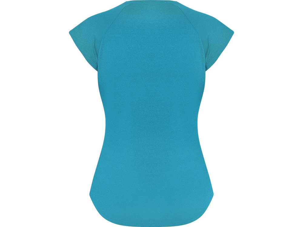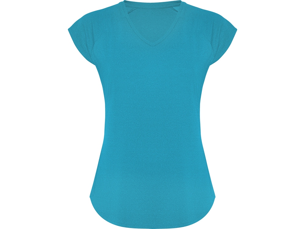 Спортивная женская футболка с коротким рукавом реглан. Вырез горловины V. Полотно из полиэстера на ощупь напоминающее хлопок. Приталенный силуэт.