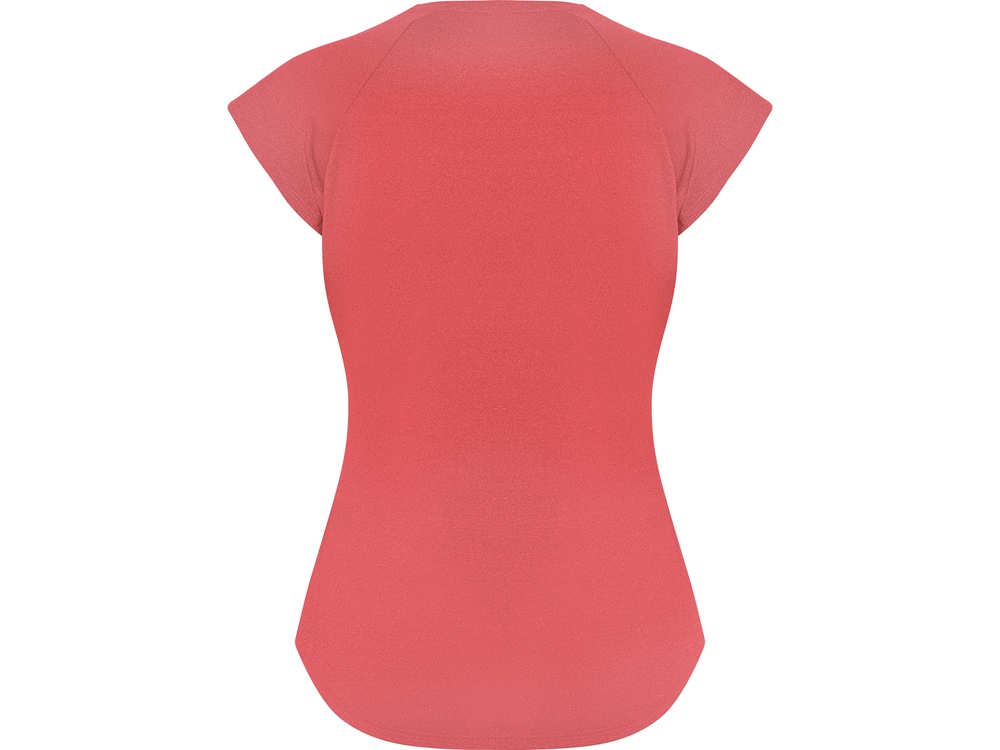 Спортивная женская футболка с коротким рукавом реглан. Вырез горловины V. Полотно из полиэстера на ощупь напоминающее хлопок. Приталенный силуэт.
