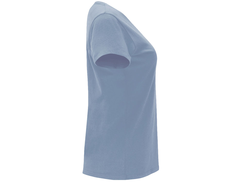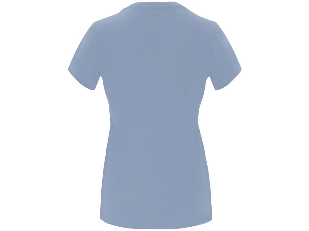 Женская приталенная футболка. Круглый вырез горловины обработан рибом 1х1. Шов горловины укреплен тесьмой.