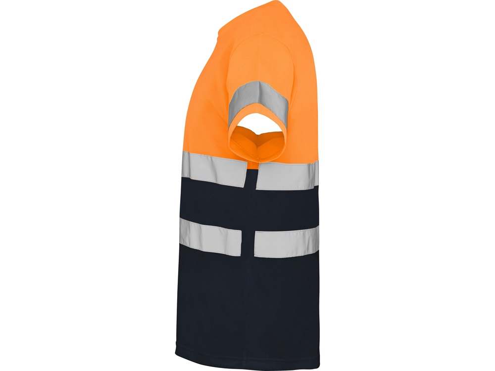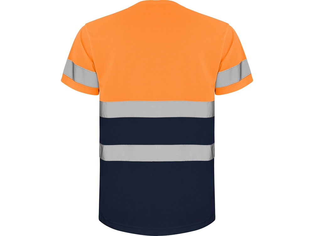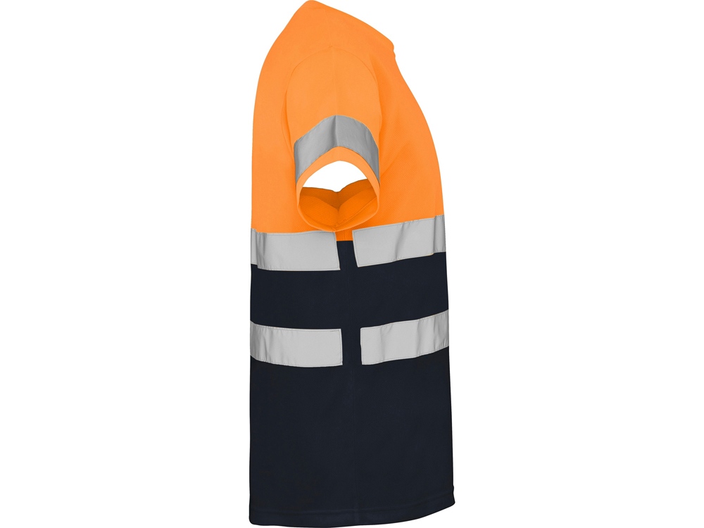 Футболка со светоотражающими элементами с короткими рукавами. Круглая горловина из той же ткани, с усиленными закрытыми швами на внутренней стороне горловины. Две горизонтальные светоотражающие полосы на туловище и одна светоотражающая полоса на рукавах.