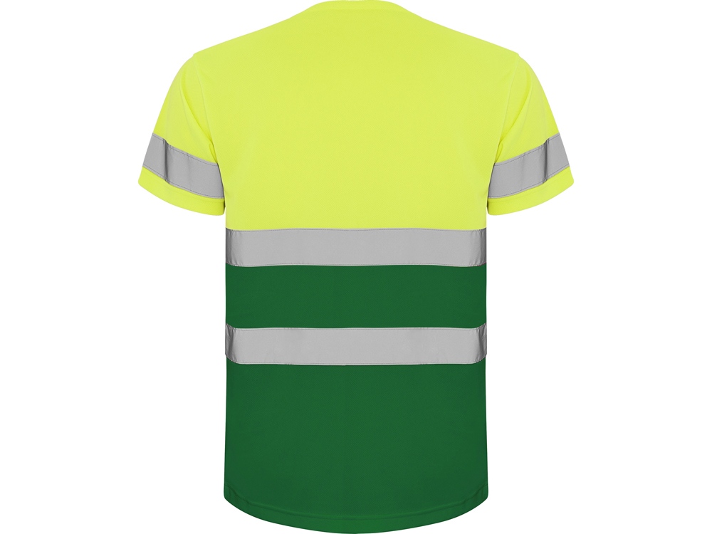 Футболка со светоотражающими элементами с короткими рукавами. Круглая горловина из той же ткани, с усиленными закрытыми швами на внутренней стороне горловины. Две горизонтальные светоотражающие полосы на туловище и одна светоотражающая полоса на рукавах.