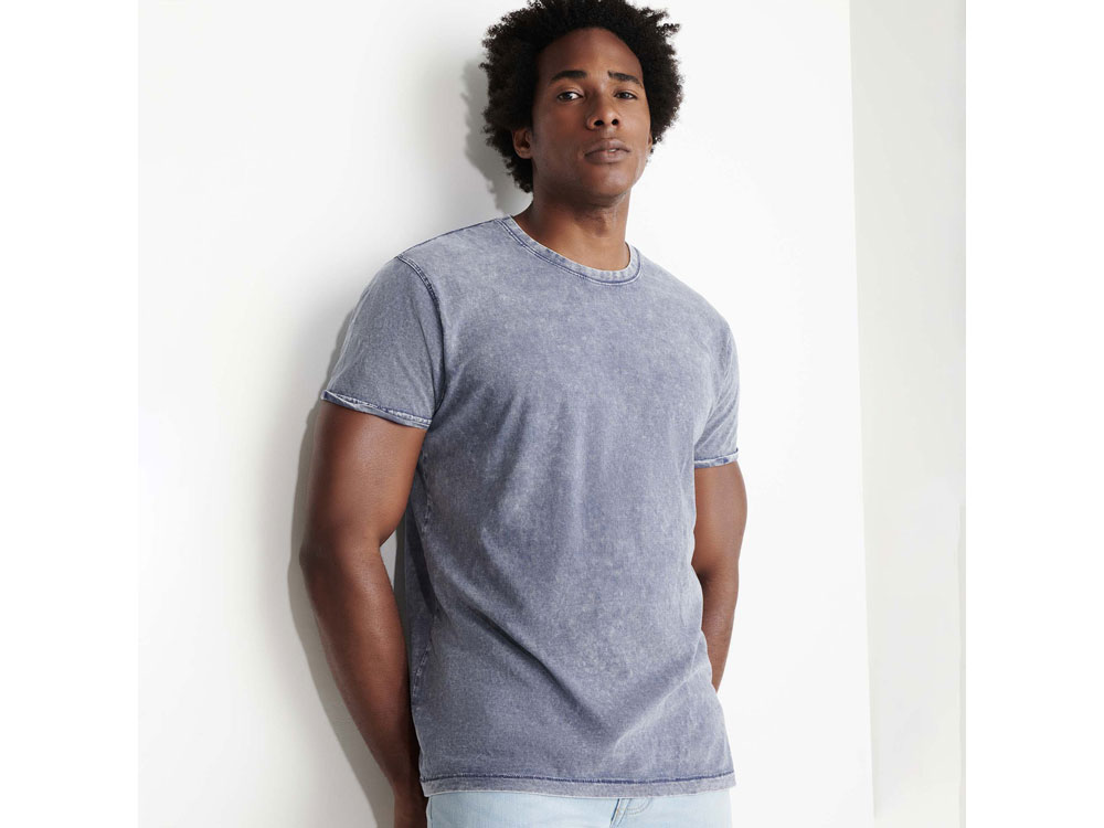 Мужская футболка с джинсовым эффектом. Короткий рукав, горловина обработана рибом 1х1 и дополнительно укреплена тесьмой. Двойная отстрочка по пройме. Рукав с закручивающимся краем. В ассортименте также представлена аналогичная женская модель Husky