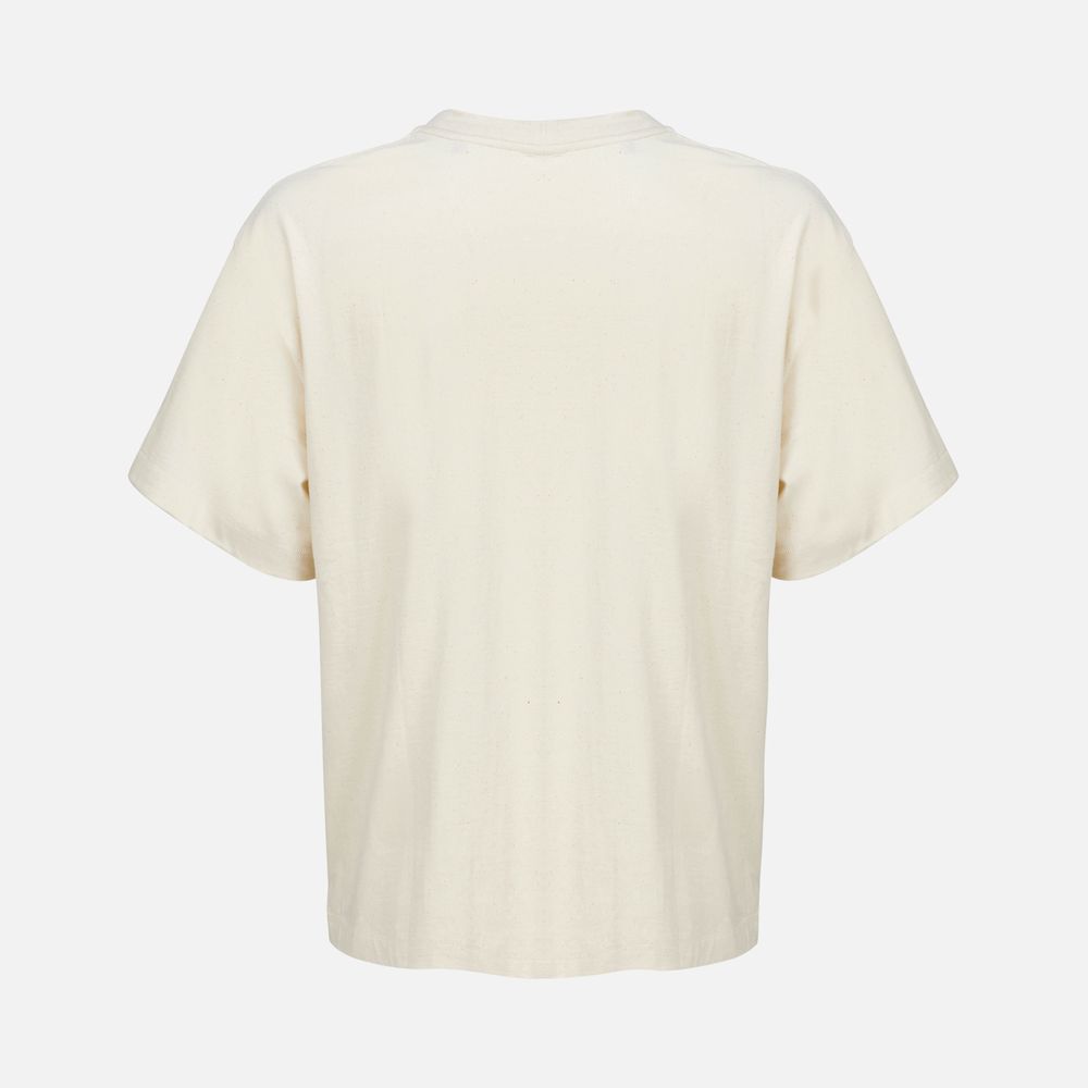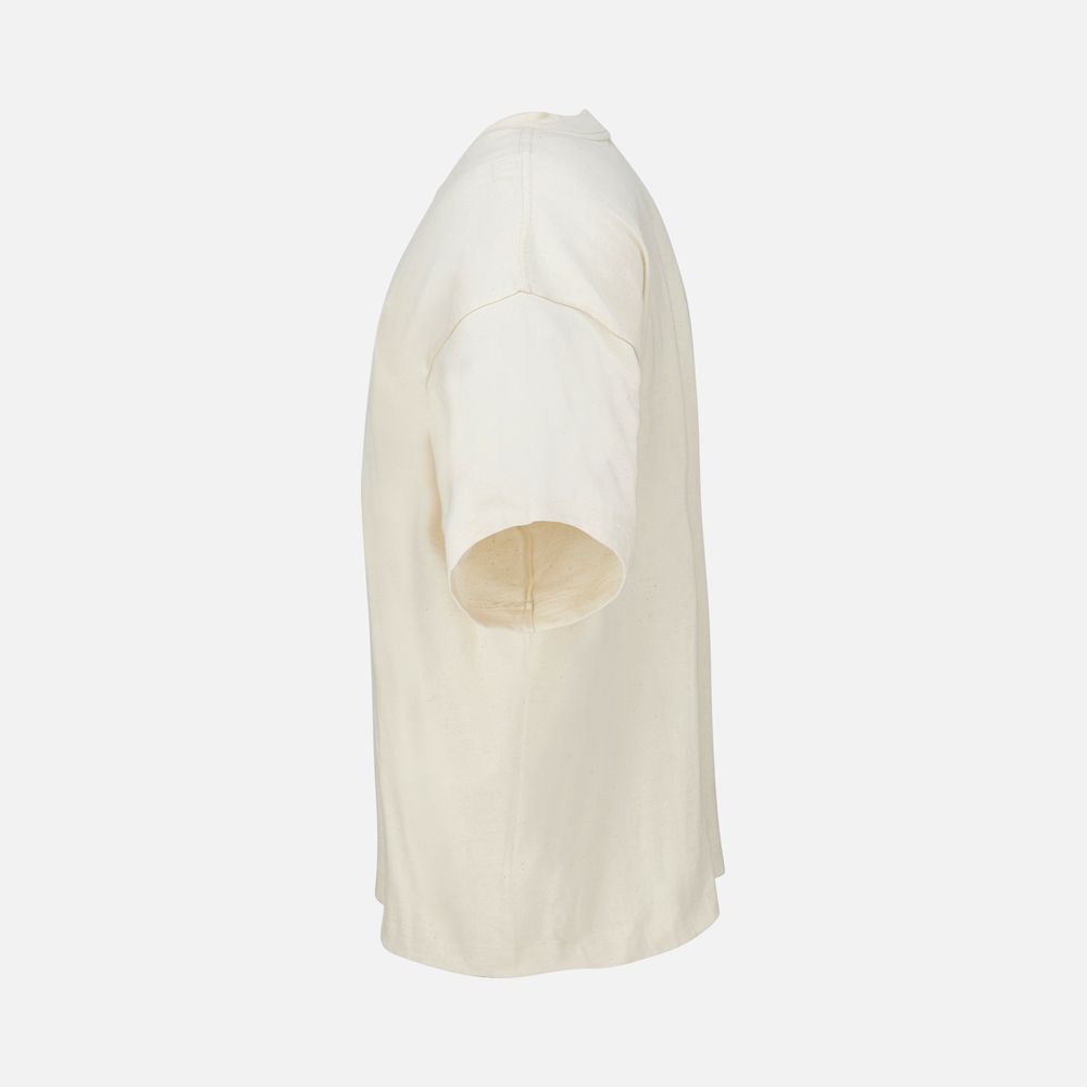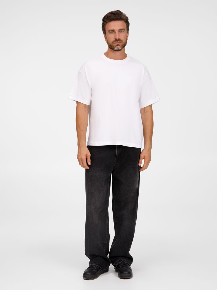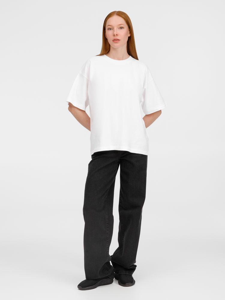 Футболка оверсайз унисекс с круглым вырезом и без боковых швов. Выполнена из смеси переработанного и обычного хлопка. Благодаря повышенной плотности отлично держит форму.