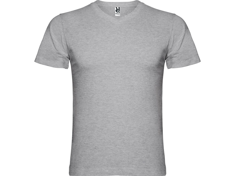 Мужская футболка без боковых швов с коротким рукавом и V-образным вырезом горловины, отделанном рибом 1х1. Горловина и плечевые швы дополнительно укреплены тесьмой.