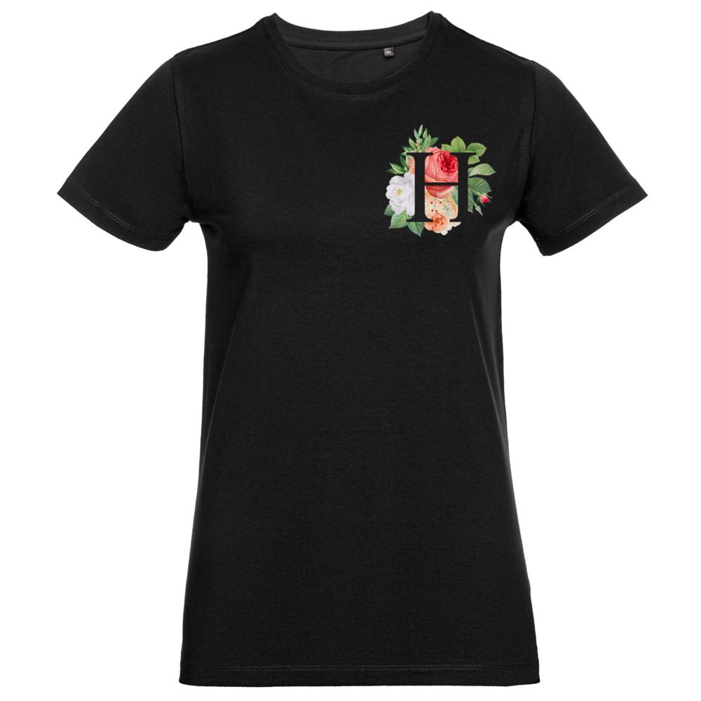Футболка женская «Цветочная азбука Н», черная купить оптом и в розницу с нанесением логотипа в Нижнем Новгороде