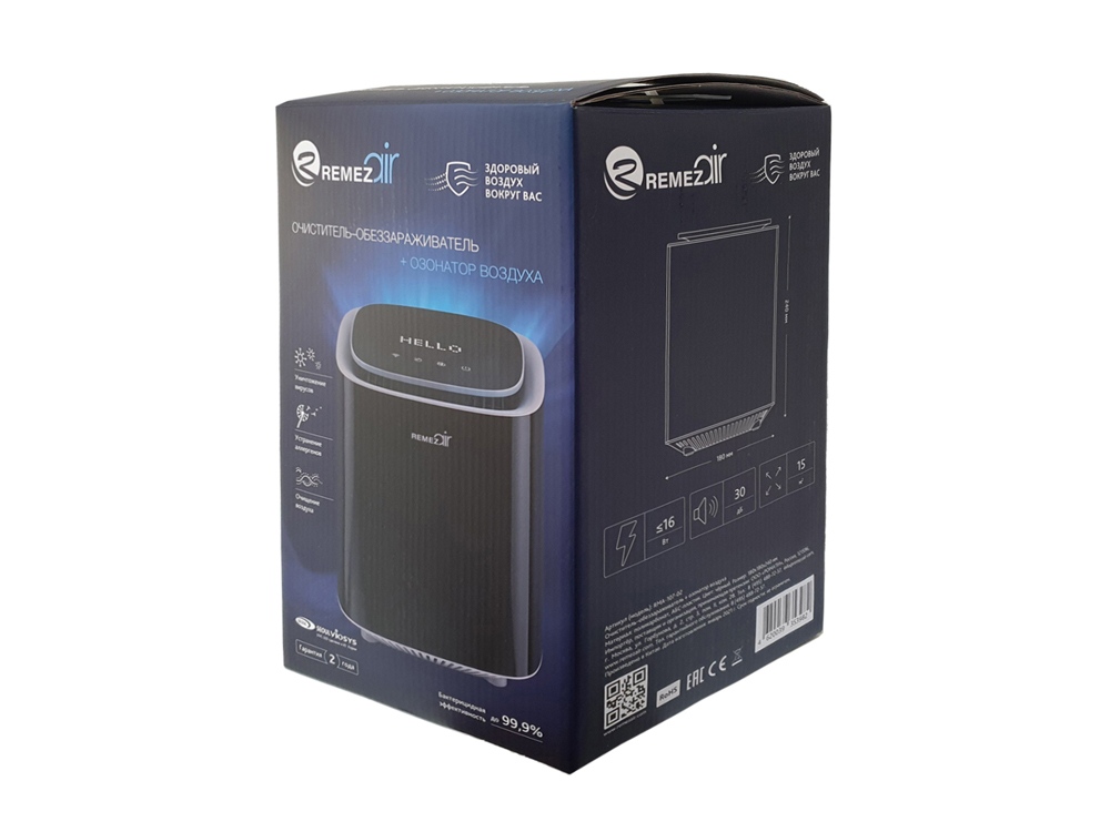 Инновационный очиститель+обеззараживатель + озонатор воздуха от REMEZair – Здоровый Воздух Вокруг Вас! Благодаря использованию УФ-технологии инновационный прибор REMEZair уничтожает до 99,95% всех известных вирусов и бактерий (вкл. COVID), делая воздух чистым и безопасным. Многоступенчатая система фильтрации устраняет из воздуха (пыльцу, шерсть и перхоть животных, пыль и споры плесени), поглощает запахи, формальдегиды и прочие летучие органические соединения. Дополнительное использование Озонатора в приборе формирует необходимую концентрацию озона, уничтожая плесень и устраняя неприятные запахи. Датчик присутствия, удобное дистанционное управление посредством Wi-Fi соединения, интеллектуальные режимы и защитная блокировка сделают эксплуатацию прибора комфортной и безопасной. Стильный дизайн, компактный размер и небольшой вес позволят использовать очиститель+обеззараживатель REMEZair как мобильное устройство, которое легко впишется в любой интерьер. REMEZair – Здоровый Воздух Вокруг Вас! Очиститель+обеззараживатель RMA-107-02 от REMEZair содержит: - Комбинированный НЕРА+угольный фильтр 2 в 1 устраняет крупные частицы пыли и шерсти животных, большинство домашних аллергенов и других мелких частиц, загрязняющих воздух. - УФ-стерилизатор. Ультрафиолетовые светодиоды повреждают ДНК вирусов и бактерий, полностью уничтожая их. - Фотокаталитический фильтр разлагает токсичные вещества, газообразные загрязнения, выхлопные газы и др. опасные соединения; - Ионизатор, насыщающий воздух отрицательно заряженными ионами, очищает его от частиц дыма и различных микроорганизмов. - Озонатор формирует необходимую концентрацию озона, уничтожает плесень и устраняет неприятные запахи.