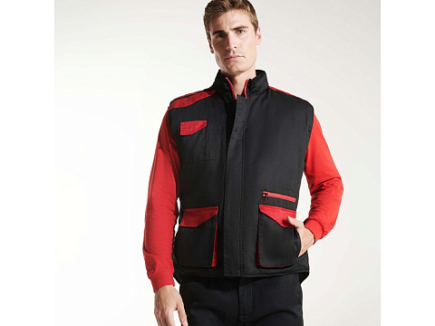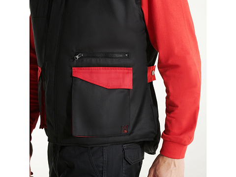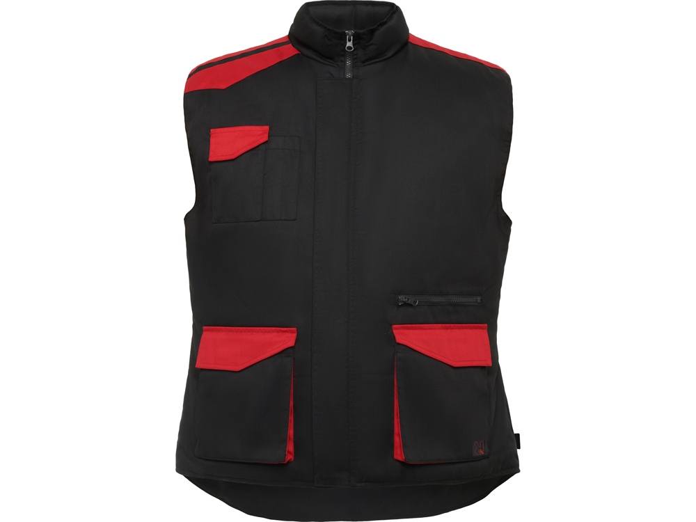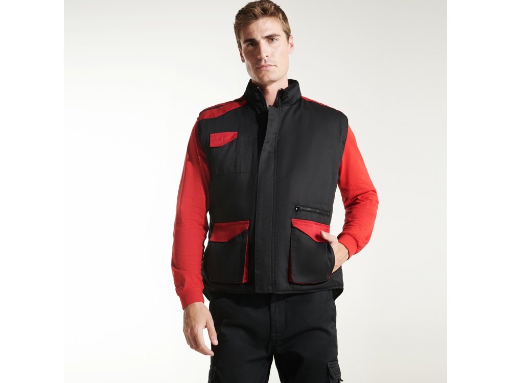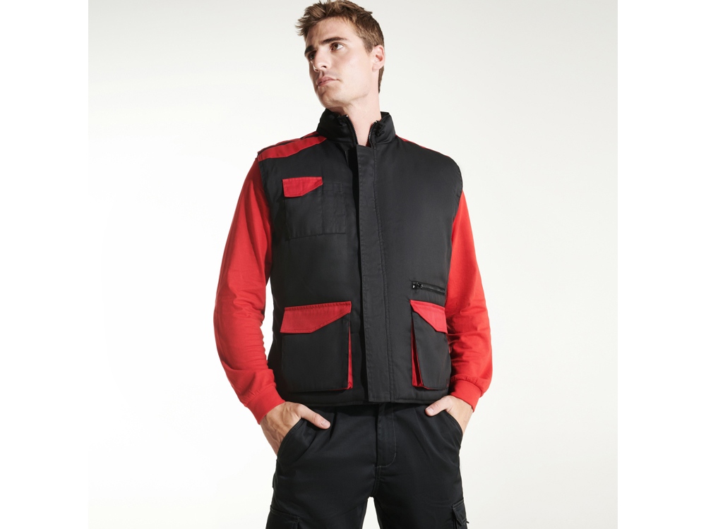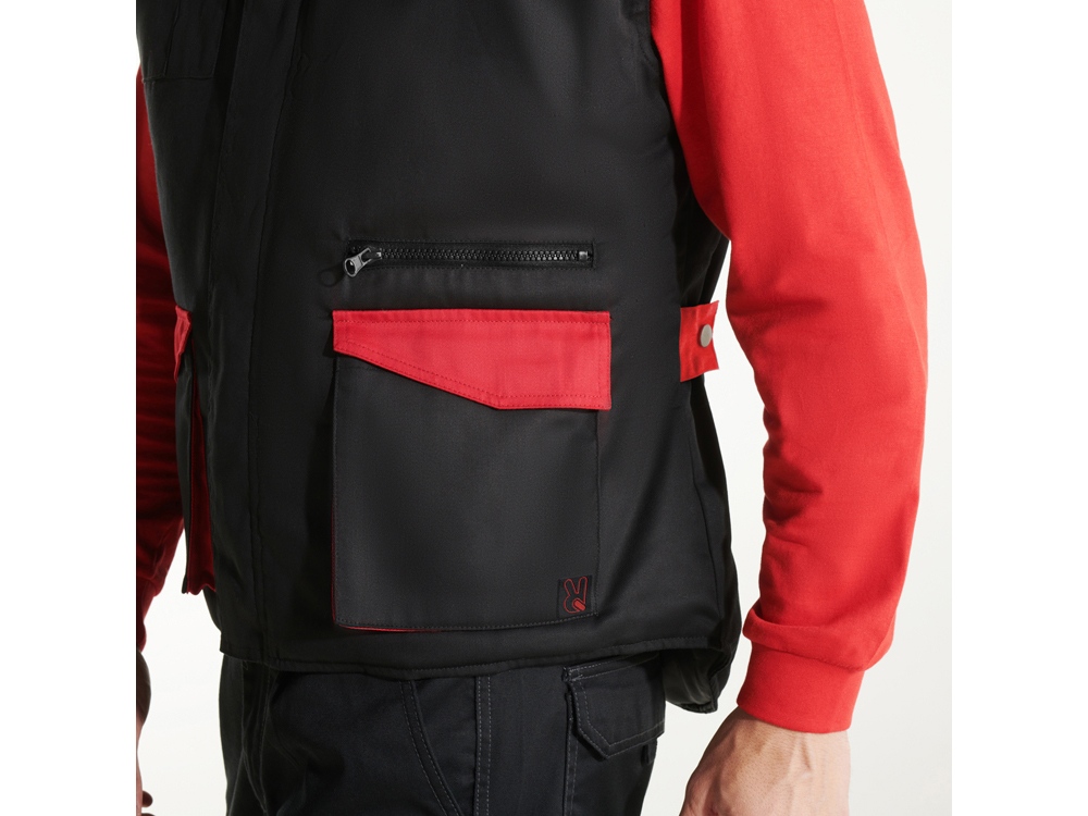 Рабочий жилет в двухцветной комбинации с несколькими карманами и высоким воротником. · Центральная молния с планкой на липучках · Правый наружный карман для мобильного телефона с клапаном и липучкой. · Два передних кармана со складками и клапанами застегиваются липучками. · Два кармана для ручек. · Внутренний карман с застежкой-липучкой. · Карман на застежке-молнии. · Закругленный низ. · Автоматический регулятор. · Контрастные плечевые части и детали.