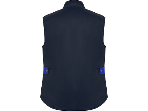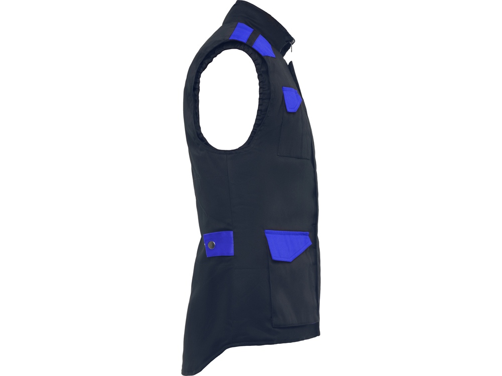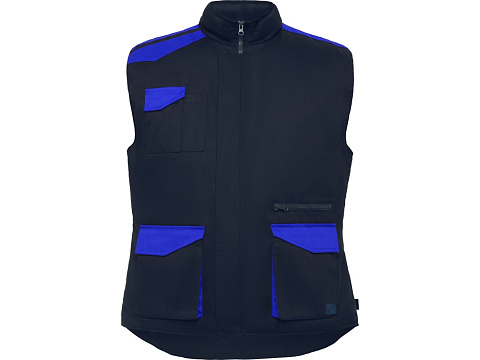 Рабочий жилет в двухцветной комбинации с несколькими карманами и высоким воротником. · Центральная молния с планкой на липучках · Правый наружный карман для мобильного телефона с клапаном и липучкой. · Два передних кармана со складками и клапанами застегиваются липучками. · Два кармана для ручек. · Внутренний карман с застежкой-липучкой. · Карман на застежке-молнии. · Закругленный низ. · Автоматический регулятор. · Контрастные плечевые части и детали.