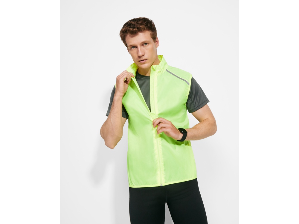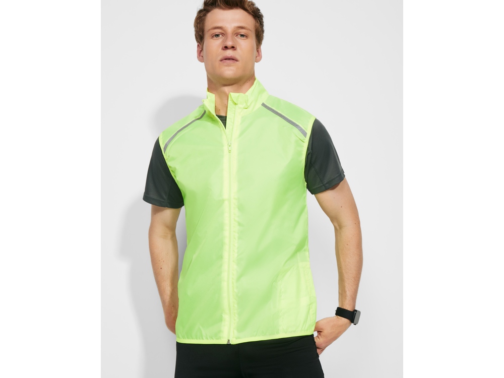 Легкий технический жилет для занятий бегом. - Молния спереди в тон с защитой для подбородка. - Проймы и низ с эластичной окантовкой. - Нижняя часть спины из микроперфорированной ткани. - Светоотражающие детали сверху, спереди и сзади. - Карман на резинке для хранения жилета и ношения на запястье.