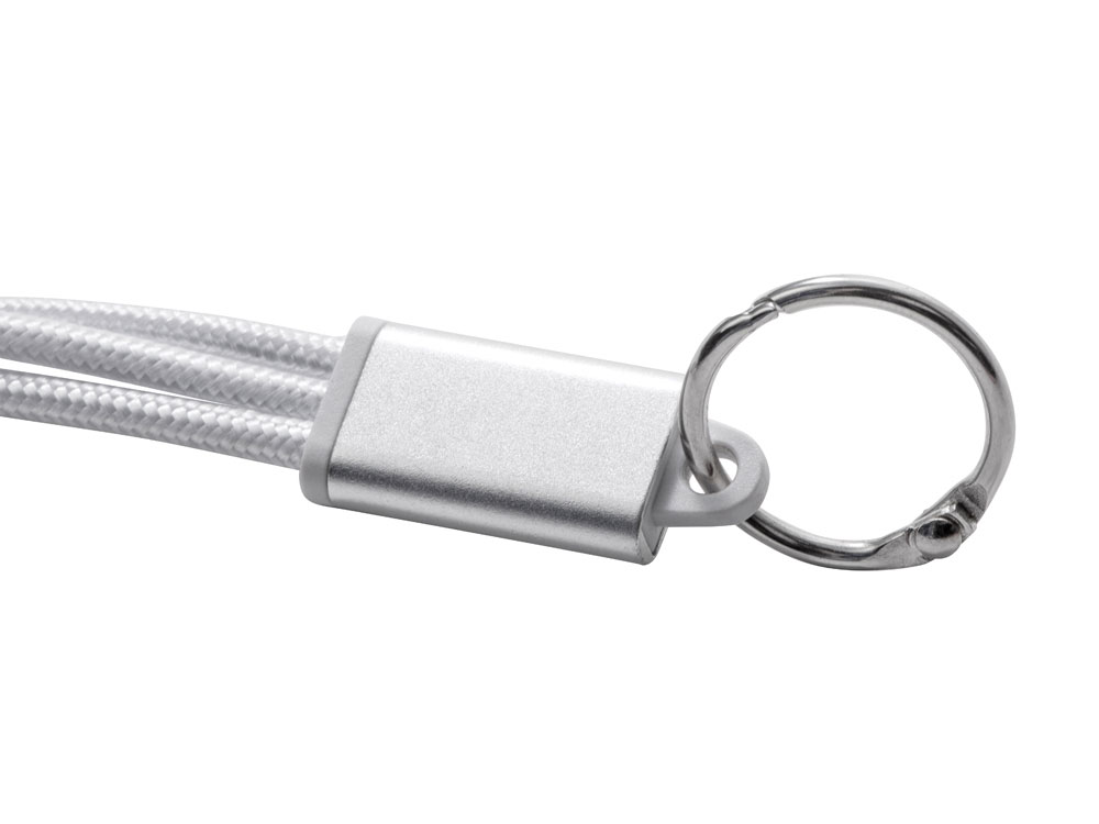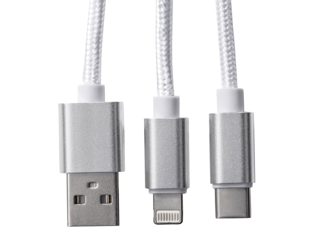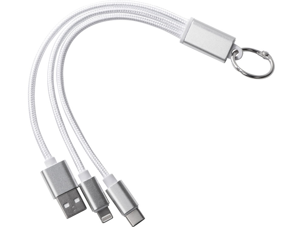 Кабель для зарядки Tres 3-в-1 с брелоком, коннекторами 1 type с, 1 USB type A и двойным совместимым коннектором 2-в-1 для устройств с ОС Apple® iOS и Android. В комплект входит брелок. Для зарядки устройств Apple подключайте кабель стороной без контактов; для зарядки устройств с ОС Android подключайте кабель стороной с контактами. Алюминий.