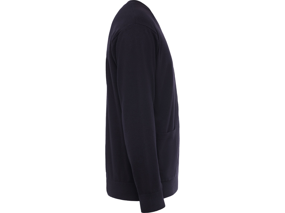 Трикотажный кардиган с застежкой на пять пуговиц. Два накладных кармана. Манжеты и низ вывязан рибом.