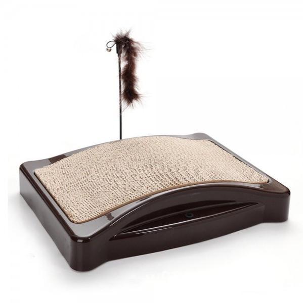 Комплект п/э подставка, экологичный гофрокартон со специальным песочным покрытием для лучшей сцепки коготков (сохраняет и отдает тепло), игривое перышко с погремушкой - пуходёрка (крепление с двух сторон когтеточки).