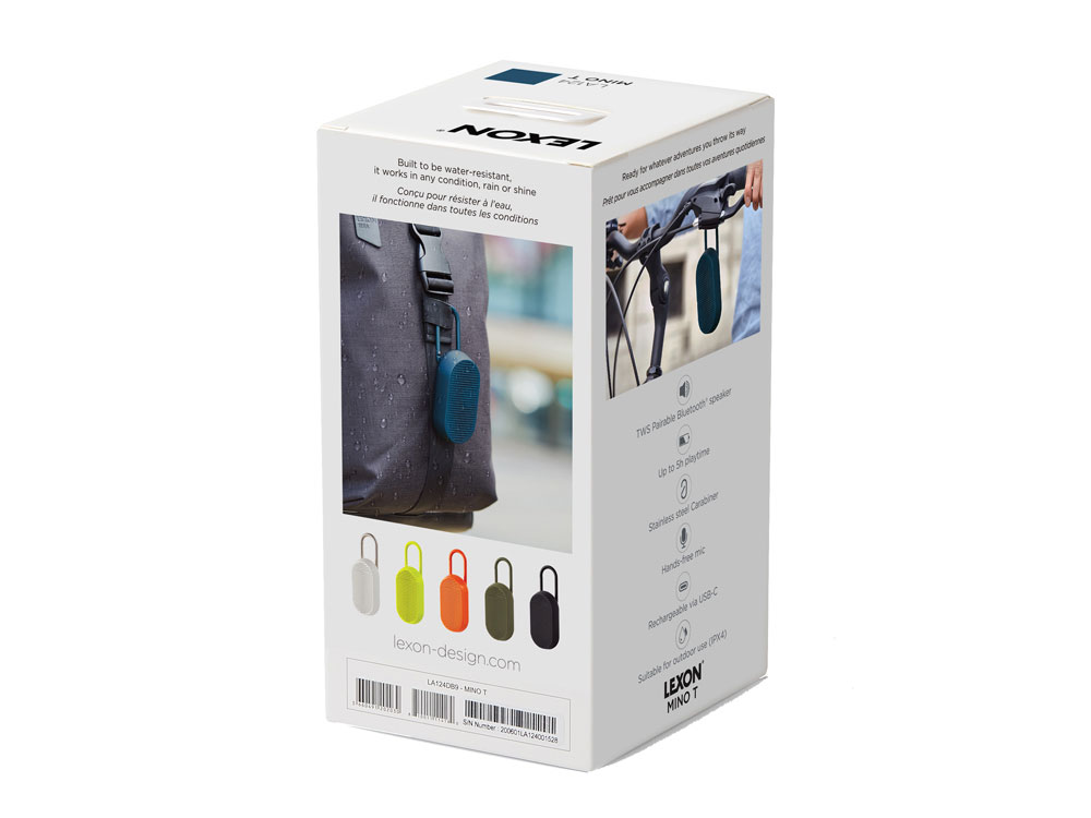 Mino T — это универсальная Bluetooth-колонка, созданная для путешествий. Карабин позволяет легко прикрепить её к сумке или велосипеду. Благодаря элегантному дизайну она гармонично впишется в интерьер, став современным элементом. Оснащённая пассивной басовой системой, Mino T обеспечивает качественное прослушивание, гарантируя сбалансированный и насыщенный звук в дороге. Не беспокойтесь о дожде: сверхпрочное покрытие делает её водонепроницаемой. Наслаждайтесь до 5 часов автономной работы в любых приключениях. Отвечайте на звонки, слушайте музыку или заряжайте колонку через кабель USB-C, установив её на док-станцию. - Bluetooth®-динамик со встроенным карабином - Совместимость с технологией TWS - Водонепроницаемость IPX4 - Микрофон hands-free - Пульт дистанционного управления для селфи - Bluetooth® 4.2 - Время работы аккумулятора: 5 ч - Время зарядки: 2 ч - Расстояние Bluetooth®: 10 м - Питание: через порт USB C, кабель в комплекте