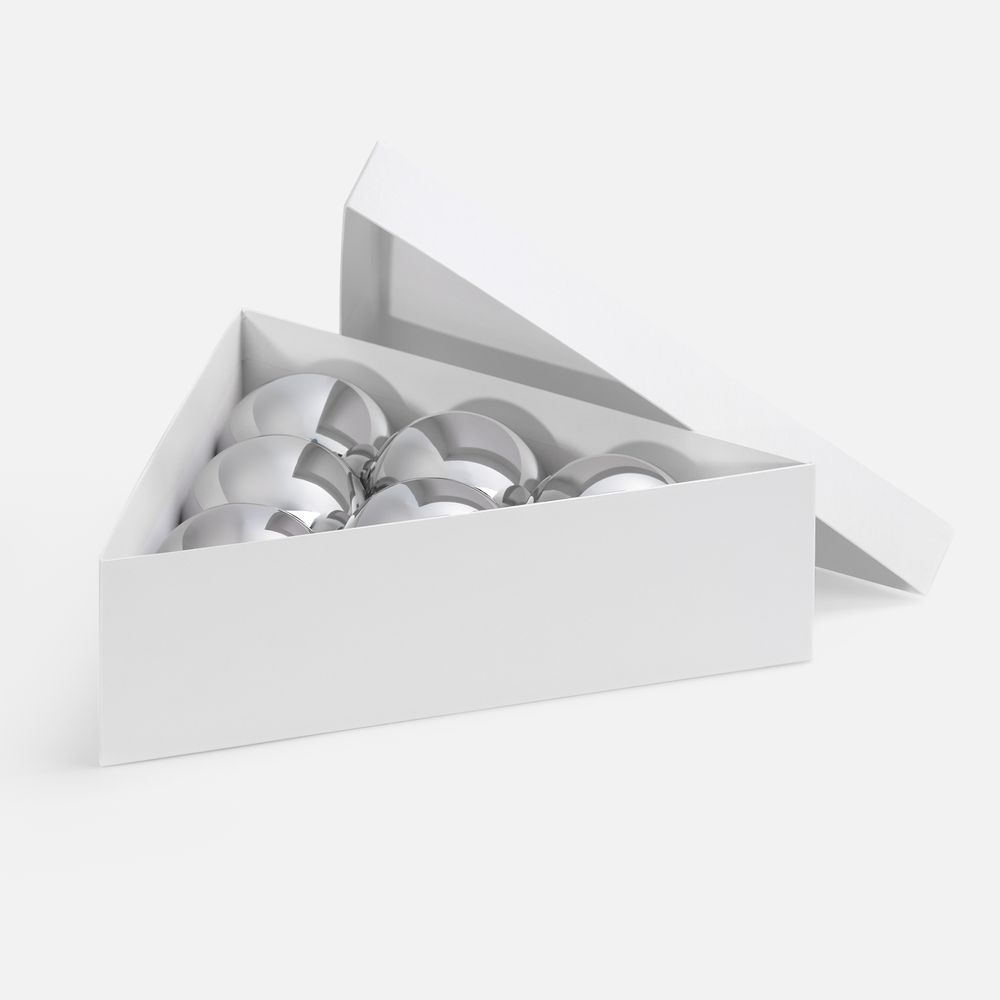 Трехгранная коробка Trigon прекрасно подходит для упаковки набора из шести елочных шаров диаметром 10 см, а также других подарков нестандартной формы.