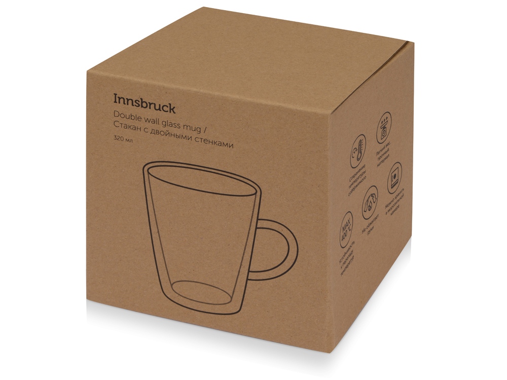 Кружка с двойными стенками Innsbruck – незаменимый аксессуар для офиса, который станет полезным и практичным бизнес-подарком. • Имеет внушительный объем 320 мл. • Выполнена из термостойкого боросиликатного стекла: оно не боится резких перепадов температур до 400℃. • Снабжена удобной ручкой. • Легкая и прочная. • Не обжигает руки за счет особой конструкции. • Подходит для хранения в морозильной камере. Внимание, стеклянная посуда с двойными стенками не предназначена для мытья в посудомоечной машине и использования в микроволновой печи. Рекомендуется бережная ручная мойка без использования жестких щеток и абразивных чистящих средств.
