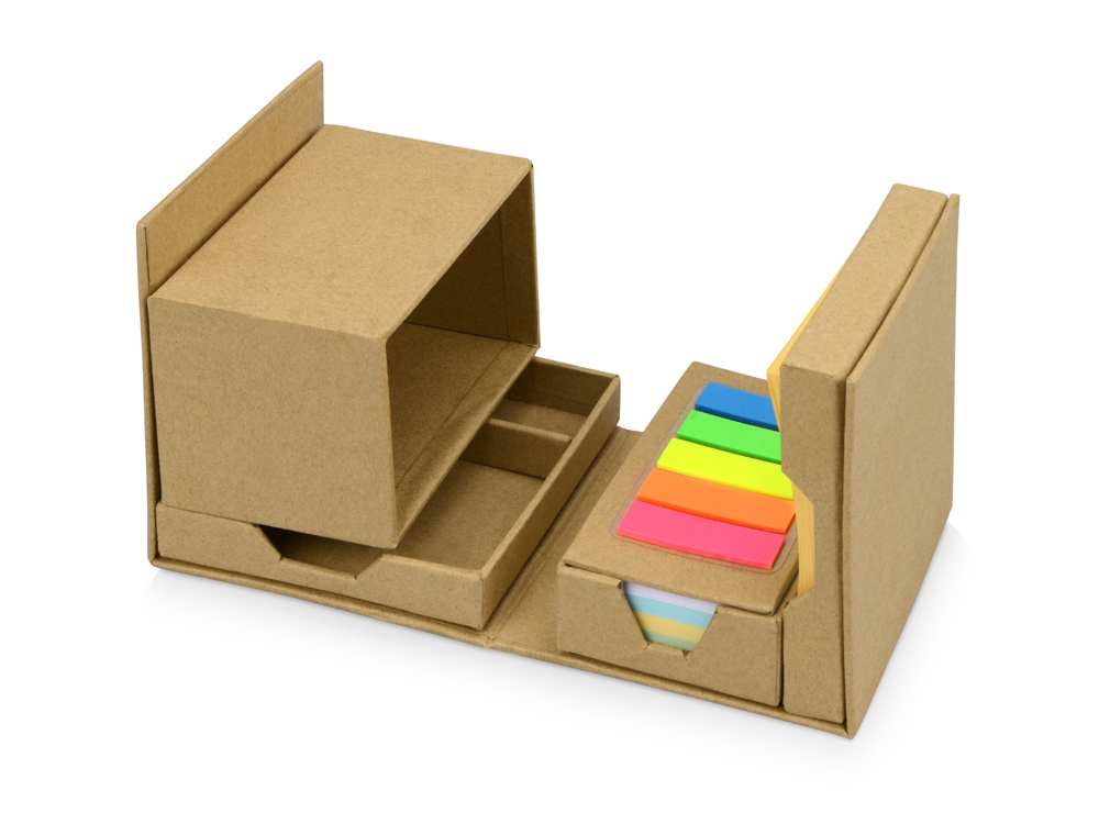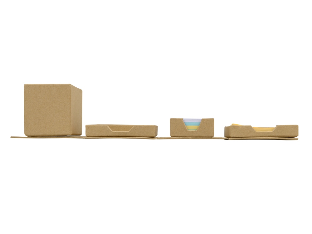 Оригинальная подставка для канцелярии Брик в сложенном виде представляет собой куб. А в разложенном – она превращается в удобный настольный прибор с отделениями для стикеров, бумаги для записей, скрепок и ручек. Настольный куб Брик сделан из бумаги и картона, и является отличным экосувениром.