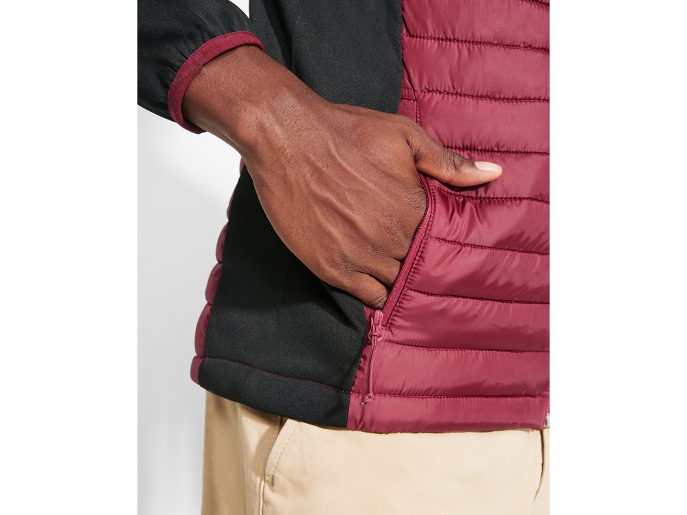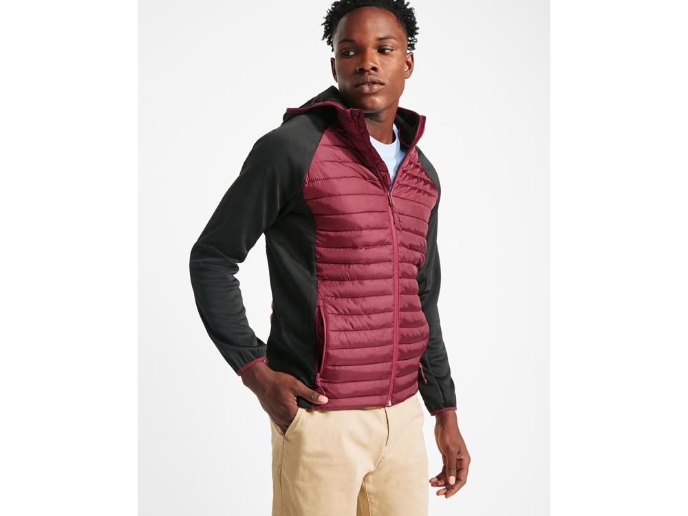 Мужская куртка из двух комбинированных тканей. - Несъемный регулируемый капюшон. - Рукава реглан. - Ткань softshell на рукавах, боковых вставках и капюшоне. - Стеганая ткань с утеплителем спереди и сзади. - Молния в тон с бегунком и защитой для подбородка. - Два кармана спереди с молнией. - Воротник, манжеты и низ с эластичной окантовкой в тон.