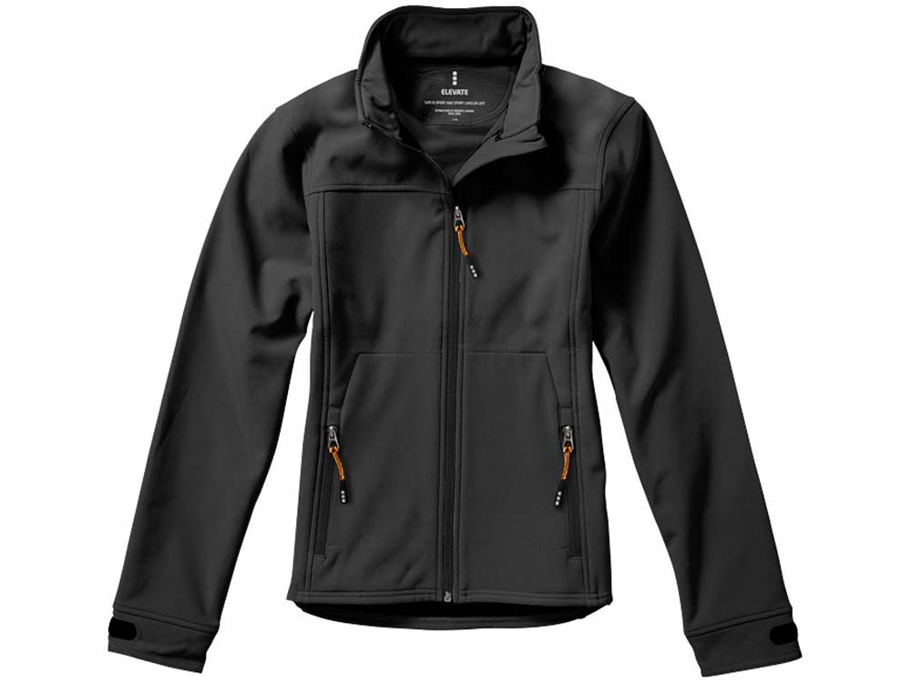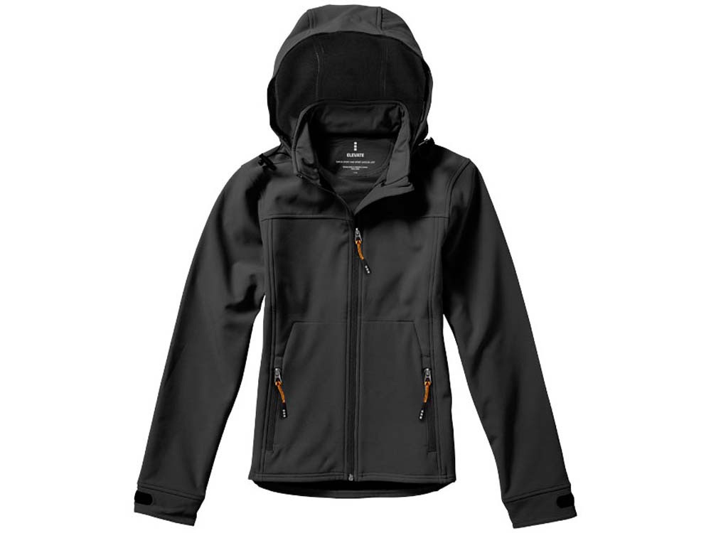 Женская куртка софтшел Langley. Стандартный покрой. Отстегивающийся капюшон на шнурках со стопперами. Обратная молния по центру и на карманах для рук. Регулируемые манжеты на липучках. Отражающий лого сзади. Водонепроницаемый 5000 мм. Дышащий 3000 мм. Ткань эластична в четырех направлениях. Ветронепроницаемая. Ремешки на собачку (второй комплект в цвете антрацит). Ткань из 90% полиэстера и 10% эластана, склеенного со 100% полиэстеровым микрофлисом. 300 г/м².