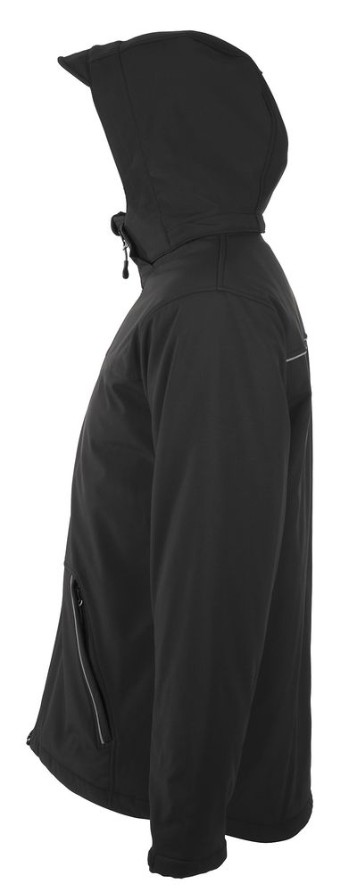 Полностью стеганый софтшелл. Снимающийся капюшон, регулируемый стягивающим шнуром, а также «липучкой» на спине. Закругленная задняя часть жакета. Две молнии для облегчения доступа к зонам нанесения. Стягивающие шнурки внизу изделия. Контрастные вставки серого цвета, светоотражающие детали.
