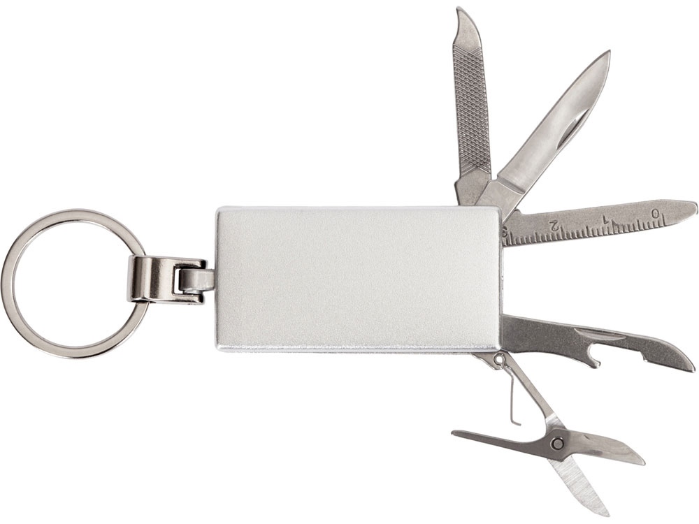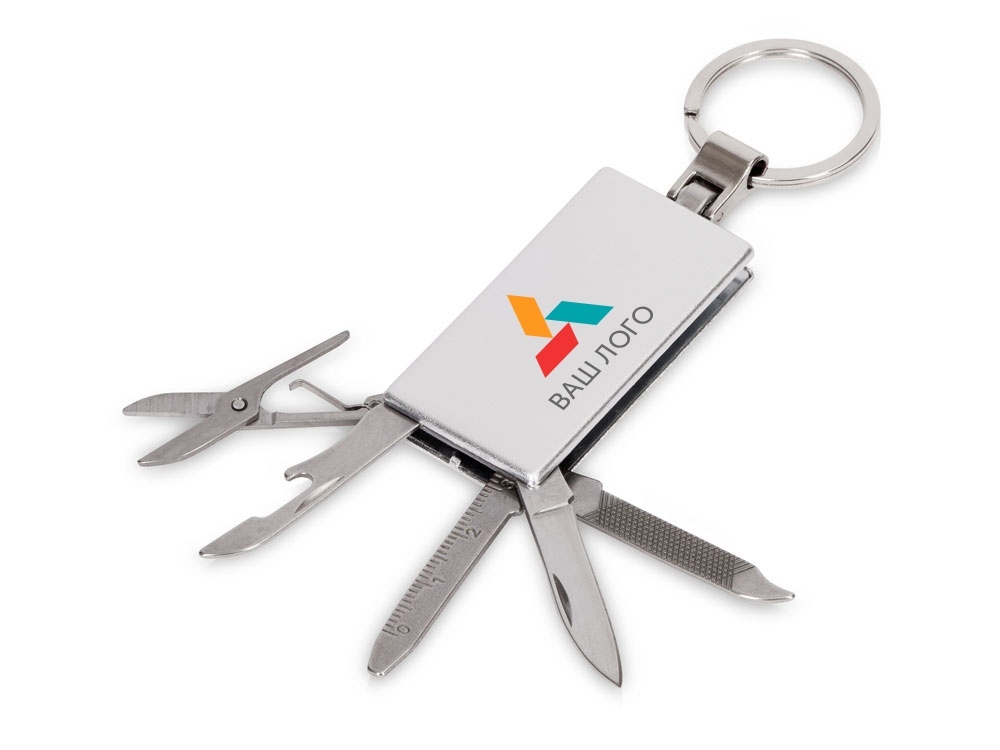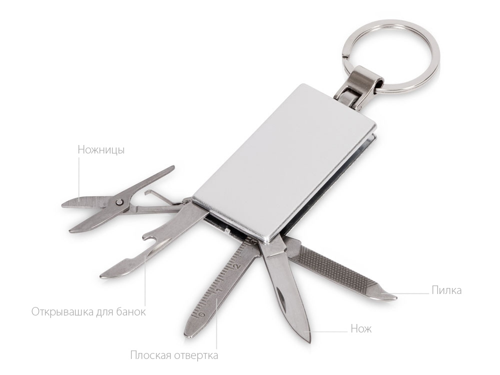 Брелок-мультитул на кольце в металлическом корпусе с заметным полем под нанесение. В комплекте нож, ножницы, пилка, плоская отвертка, открывашка для банок. - 4 самых нужных инструмента всегда под рукой - металлический корпус обеспечивает прочность, а значит, и долгую жизнь