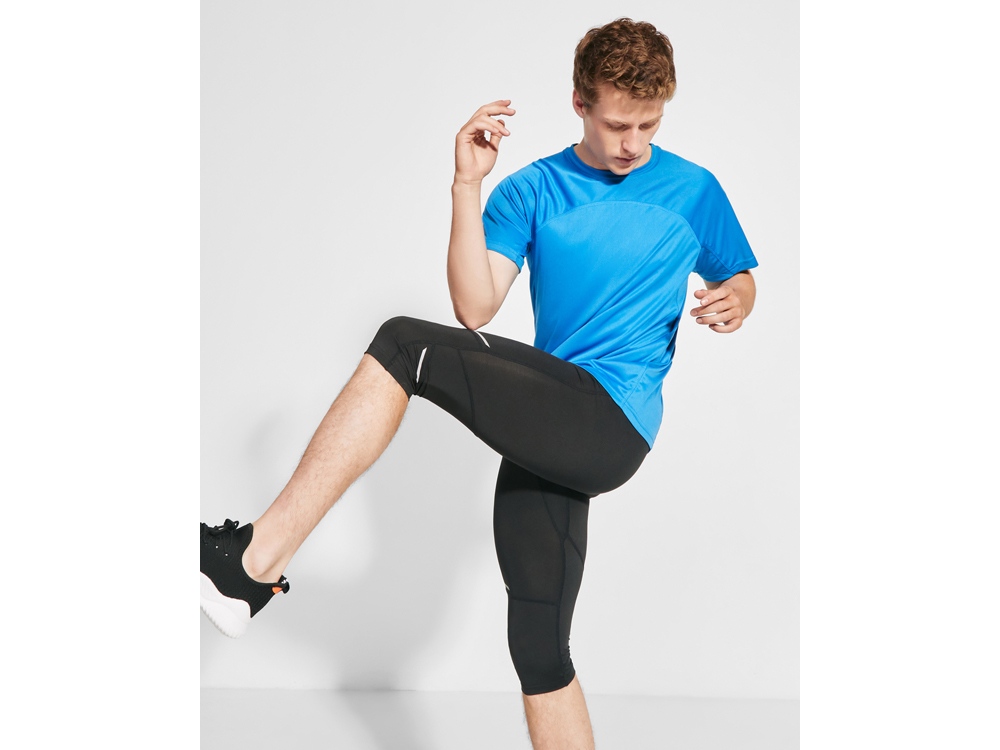 Мужские спортивные легинсы длиной три четверти. Эластичный пояс с внутренним шнурком для регулировки. Светоотражающие детали. Карман сзади на молнии.