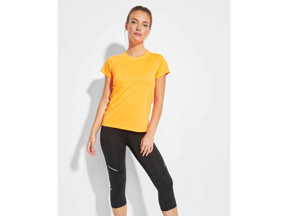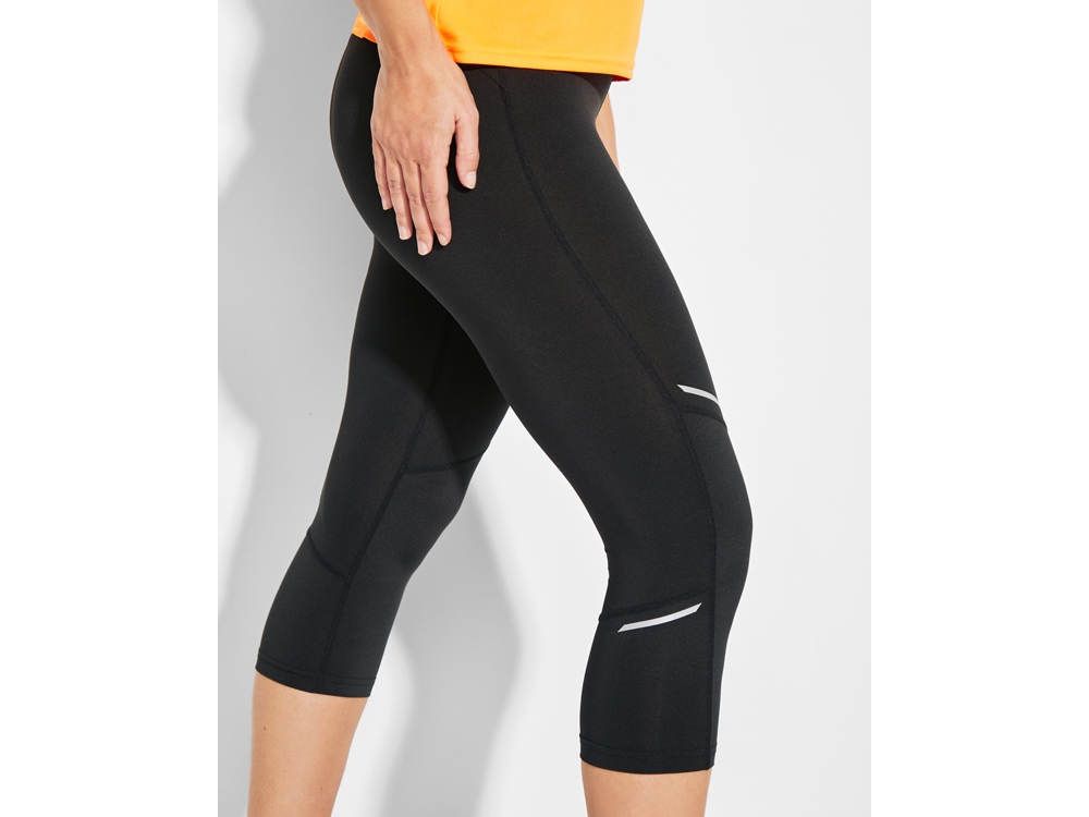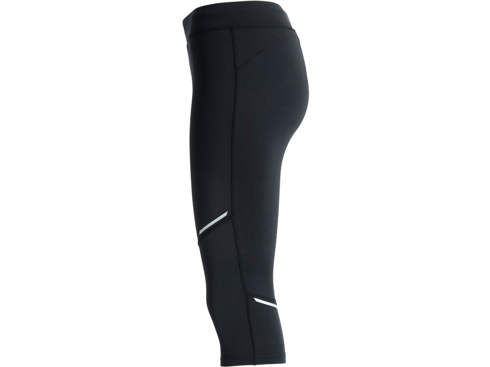 Женские спортивные легинсы длиной три четверти. Эластичный пояс с внутренним шнурком для регулировки. Светоотражающие детали. Карман сзади на молнии.