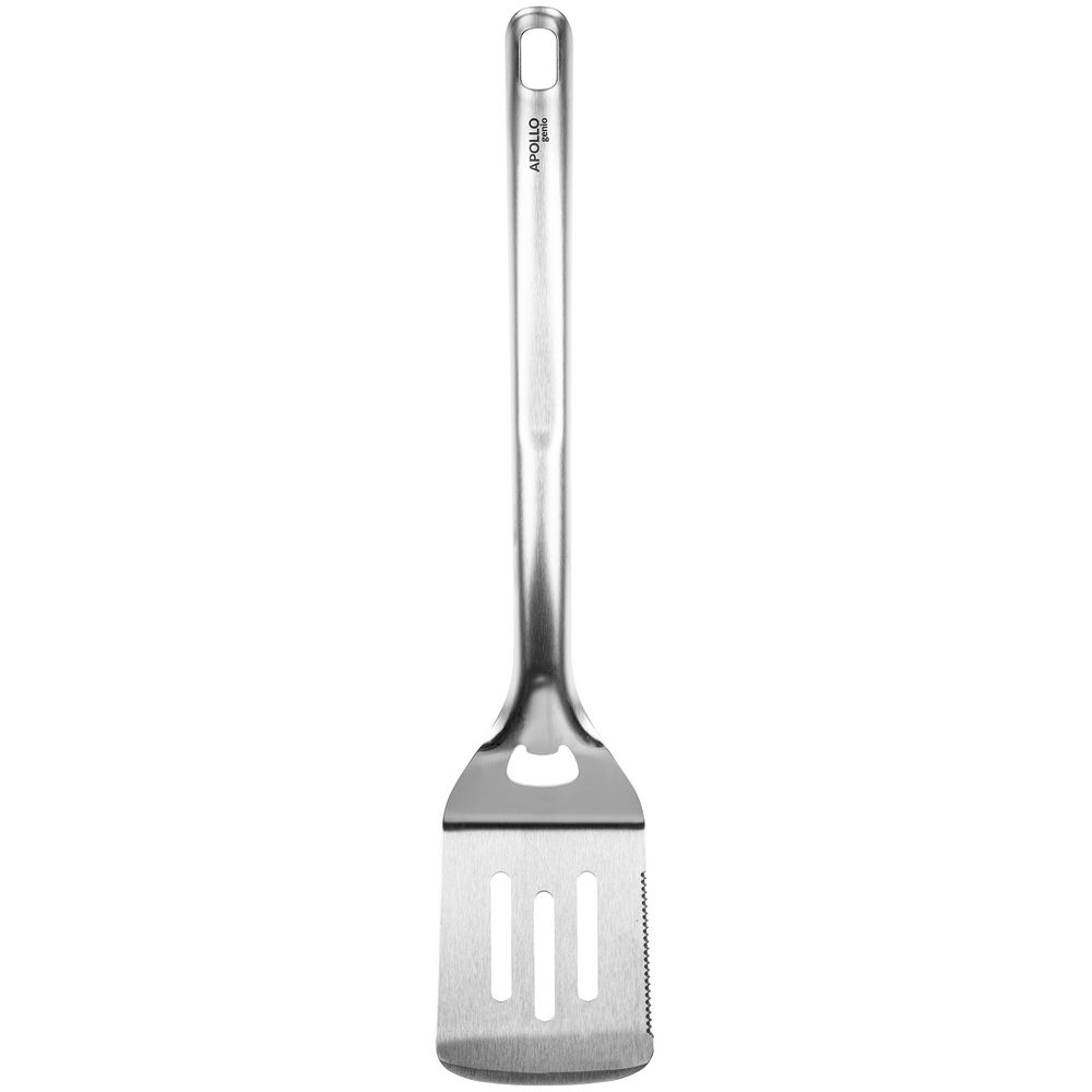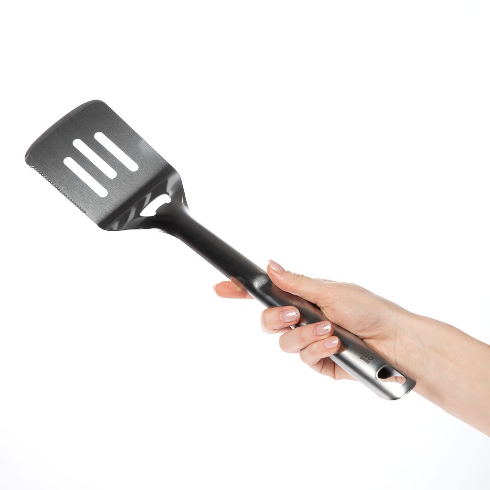 Лопатка Grillo предназначена для переворачивания продуктов на гриле, мангале или жаровне. Прорези позволяют стекать излишкам масла, соуса или жидкостей. Зубчатый край поможет разрезать большие куски при подаче, а встроенная открывашка — не остаться без прохладительного напитка. Имеет оптимальную длину для безопасного использования и отверстие, позволяющие удобно подвесить прибор на крючок.